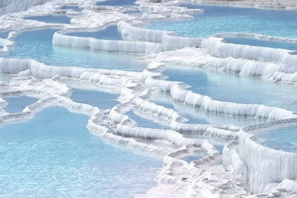 Це, мабуть, найдивовижніше місце в Туреччині, де знаходяться одразу два "дива світу": руїни античного міста Хієраполіс та унікальні термальні ключі. Температура води термальних джерел 40 градусів, причому незалежно від сезону! Сліпучо-білі тераси виникли на схилі гори в результаті відкладення солей з насичених кальцієм джерел.