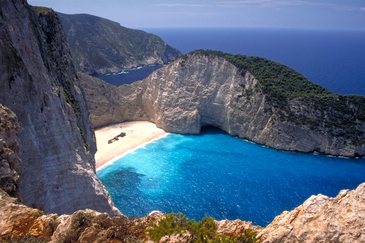 Закінтос має безліч мальовничих бухт, але найвідомішою є Бухта Навагіо. Тут знайшов притулок, викинутий на берег піратський корабель. Блакитна і чиста вода до самого дна, високі скелі і напівзруйнований корабель – роблять цей пейзаж найвідомішою візитівкою острова. До пляжу можна дістатися катером, оскільки доступ до бухти існує тільки з боку моря. Щодня, з порту Волімеса, вирушає катер, на ньому можна побачити це унікальне видовище.