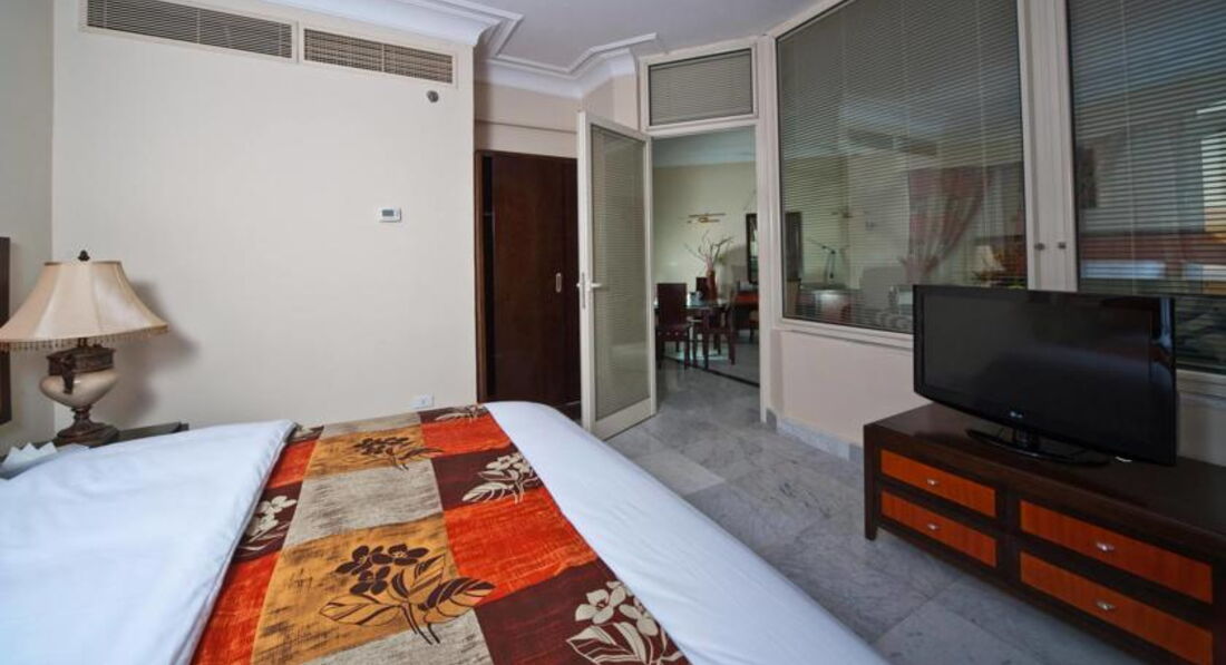 В номере есть старые светильники и пыль, грязь в шкафу, которой быть не должно в отеле 5*. Телевизор рябит, вечером вообще ужасно, смотреть не возможно, есть несколько русских каналов. Вода тоже идет без напора сперва и даже иногда ржавая, но если спустить минуты 2, то идет нормальная.