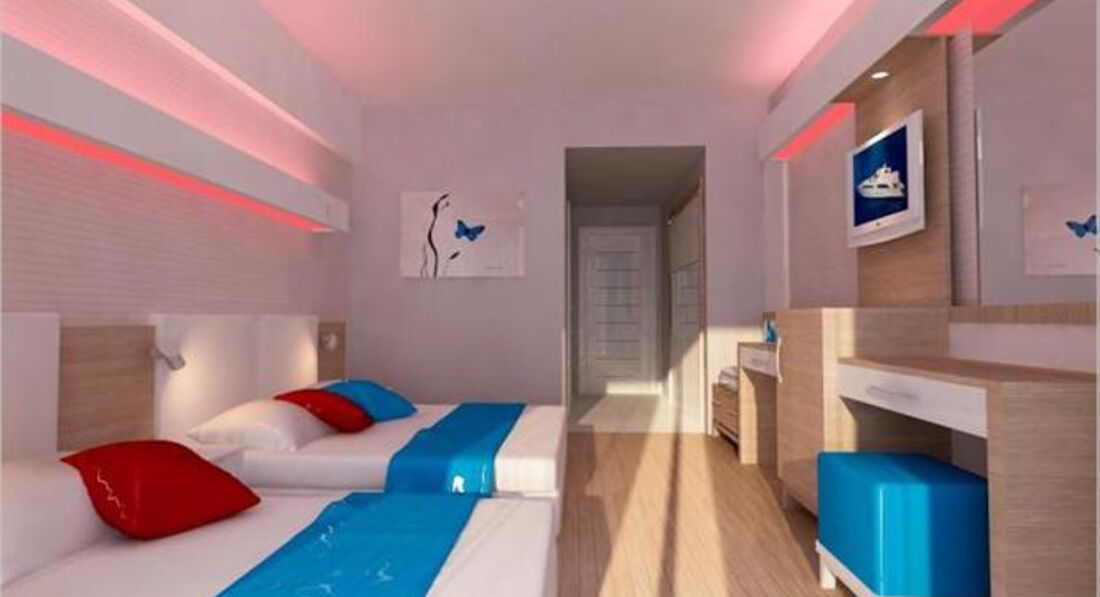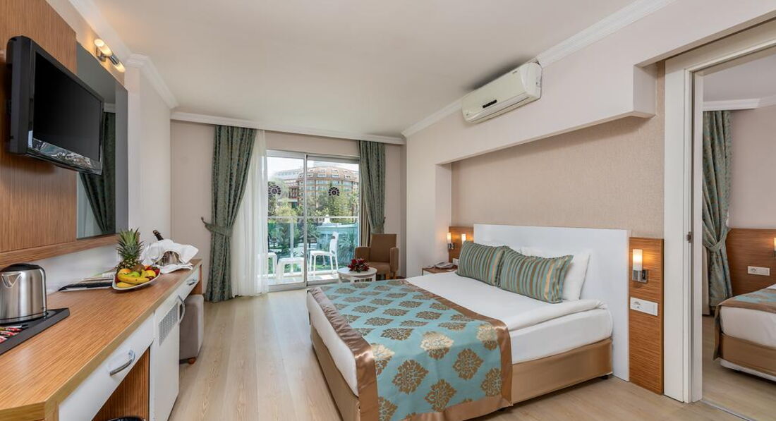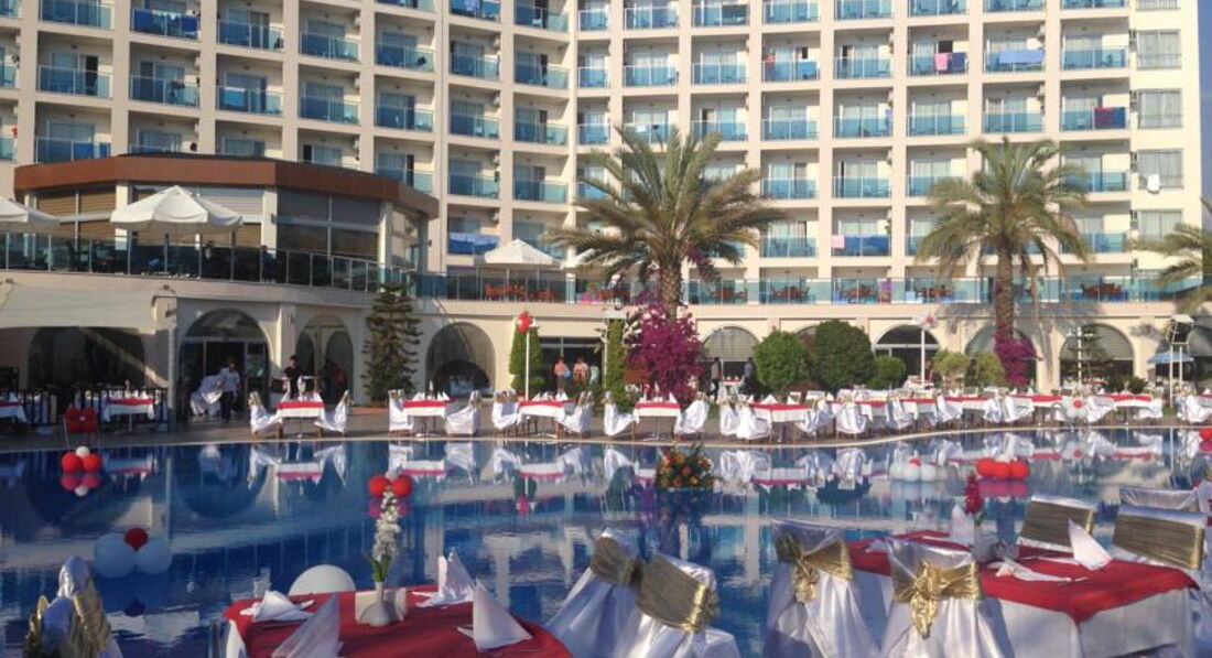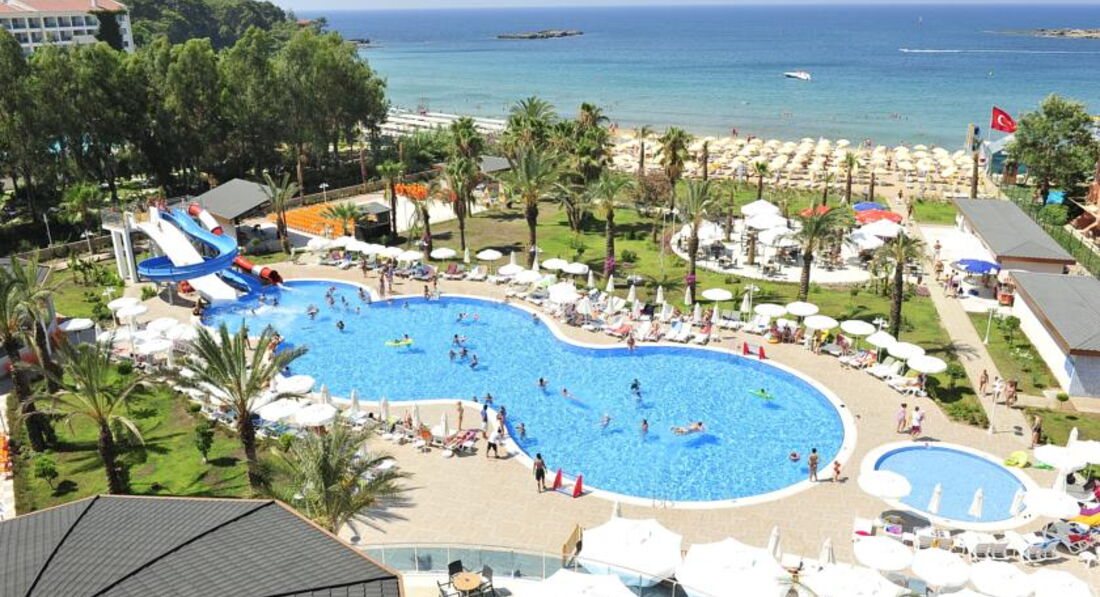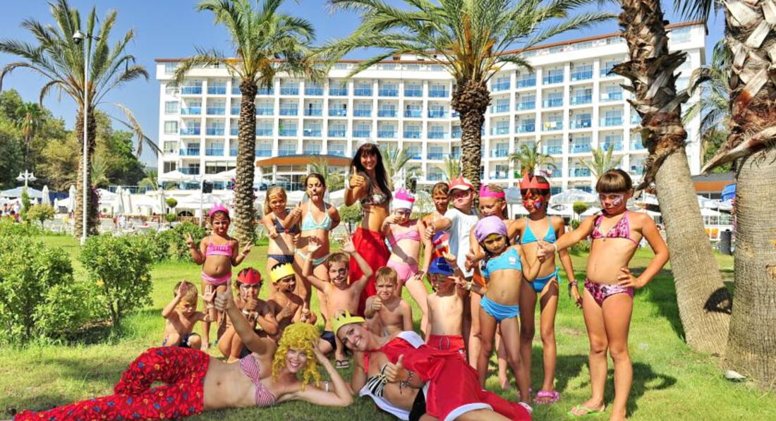 В этот отель попали случайно. надо сказать это наш первый отдых с ребёнком (4 года) + я глубоко беременна. Но нам все понравилось, считаем, что очень повезло с путёвкой. В Турции не в первый раз да и вообще на пляжном отдыхе заграницей, есть с чем сравнить. Отель новый и семейный, но я считаю понравится детям не старше 10 лет. Анимация слабенькая, ненавязчивая, но очень доброжелательная. Самый классный аниматор - Марио. Остальных даже не запомнила как зовут. Ежедневно аквааэробика и степаэробика, волейбол и боча на пляже, пару раз были пенные дискотеки днём и вечером. Муж иногда участвовал в играх у бассейна и в соревнованиях дартс. Ребёнок каждый вечер в 21 ходил на мини диско, за время отпуска привезли домой несколько разученных весёлых танцев. В 22 начиналось шоу для взрослых. Дети там тоже были, просто мероприятие уже ориентировалось на старшее поколение - Шоу огня, кабаре, разные привозные артисты. Честно говоря, мы задержались только один раз из любопытства. Но народ собирался каждый вечер. В номере кстати хорошо слышно все это мероприятие, но мы легко засыпали и под эти напевы. Были и тематические вечера - турецкая ночь, гала-кжин (все столики из ресторана выставили у бассейна, на стулья повязали банты и очень красиво украсили территорию) и окончание рамадана. Территория кстати очень компактная, но довольно уютная. 2 бассейна - общий и лягушатник, 3 универсальных водных горки - катаются и дети и взрослые. Детский бассейн утром намного прохладнее, чем взрослый. Наверное воду в нем ежедневно обновляют. Но вечером он больше напоминает горячую ванну, так как быстро прогревается. Проблем с наличием шезлонгов, полотенец И так далее у нас не было. Хамам не пробовали, но слышали негативные отзывы. На территории ещё есть детская площадка с горками и качелями. Очень порадовал номер с видом на море, в обеденное время музыку у бассейна выключают и можно спокойно соблюдать режим дневного сна. В номере с видом на дорогу не была, но думаю очень шумно. Там активная и сильнозагруженная трасса. Персонал приветливый и неравнодушный. Официанты старательные, отзывчивые, ресепшн русскоговорящий, уборка номеров во 2 половину дня. Нормальная. Но мы еще сами не сильно требовательные. Контингент туристов разнообразный, русских процентов 20, в основном европейцы. Анимация одновременно на четырёх языках, что даже на мой взгляд добавляет ей определённый шарм. Ни разу не видела пьяных людей или других неадекватов. Правда напиться с турецкого алкоголя наверное сложно, все ожидаемо разбавленное. С напитками вообще там беда. Мы пили кофе мокко по утрам, ребёнок - горячий шоколад из кофемашины. Свежевыжатый апельсиновый сок можно получить на завтрак за 2 евро (около отеля за 1 евро продают). Остальное - юппи, которое сложно даже отмыть/отстирать если капнешь. Вода охлажденная в бутылках в свободном доступе. Айран не понравился. Но круглосуточные арбузы легко решают проблему жажды. Фруктов много каждый день. Абрикосы, нектарины, арбузы, дыни, персики, яблоки, апельсины, Алыча, иногда бананы, один раз черешня. На завтрак чередовали изюм, инжир, курагу. Мясо в разных видах - индейка, курица, говядина, реже ягнёнок, один раз большой баран. Разная рыба каждый день - скумбрия, форель, дорада. Вкусно на гриле. Есть диетический стол - там отварное мясо, овощи, рыба без специй. Очень вкусное м