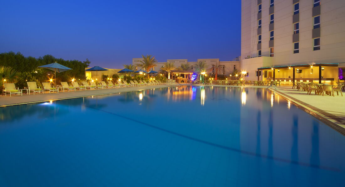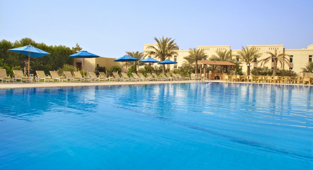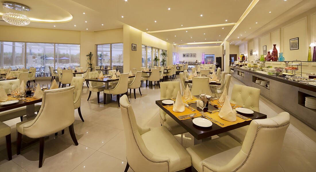 • Система "Все включено" діє з 11:00-22:00, включає сніданок, обід та вечерю в ресторані Al Nakhla, чаювання з 15:00-17:00 у Garden Brew Cafe/Tides Pool Bar, безалкогольні та стандартні алкогольні напої в Al Nakhila під час їжі, Coffee Shop, Acacia Club (під час Рамадану буде закрито), Tides Pool Bar; у готелі Beach Resort обід у ресторані Oasis, напої з 11:00-17:00 у барі біля головного басейну.