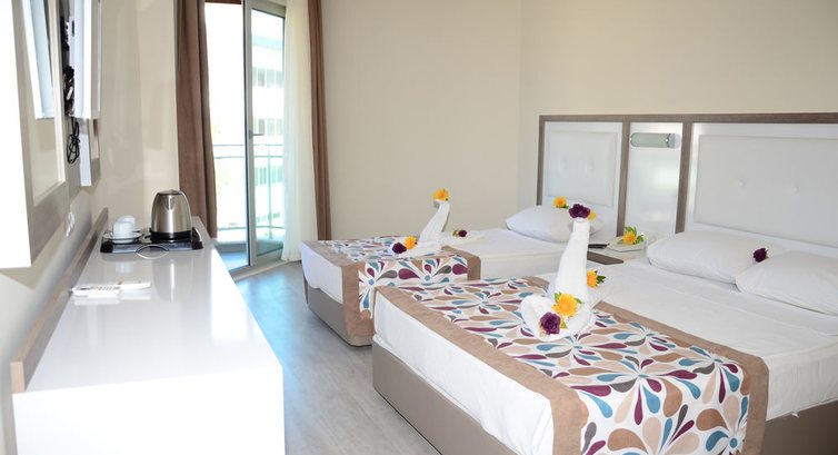 Отдыхали вдвоем с коллегой по работе, покупали сингл, разметили по одному в двухместных номерах, все очень прилично. Чисто, влажная уборка - регулярно, мусор выносили каждый день, полотенца меняли через день. В номере холодильник, электрический чайник, два стакана, чай в пакетиках, кофе (добавили, когда осталось немного, но и в ресторане всегда можно взять с собой в номер). При заезде в холодильнике стояла бутылка с питьевой водой - 1,5 л, больше не добавляли, необходимости в этом не возникало лично у меня.. Питание, в целом, неплохое,хотя выбор не большой, в особенности мясных блюд. Помидора, огурцы, зелень - всегда,все свежее, нарезкой в салатах и целиком (помидорка черри - очень вкусная, сладкая), насчет салатов с майонезом - попробовала один раз, не понравилось, масло у них тоже не вкусное, скорее всего спред, колбаса - не убедительна (ни по цвету, ни по органолептическим свойствам), но это не их вина, это производство в Турции, либо поставляется, что дешевле. Кстати, разговаривали с местными русскими, если хотите сделать приятное кому-то из друзей и знакомых, проживающих в Турции - везите с собой в качестве презента нашу качественную колбасу, а для турок это не критично, они мясо едят. Мясные блюда присутствовали в меню каждый день, курица - без ограничения в порциях. Радует, что все в меру приправлено и посолено. На завтраки даже каши присутствовала (кто с детьми),блинчики, булочки. Пиво - Эфес - отличное, не разбавленное! Вино столовое - двух наименований, водка, виски (пойдет, если не придираться). Бар работает с обеда и до вечера. Персонал доброжелательный, вымогательств никаких нет, да и собственно иностранцев (немцев) не так много было в отеле в наш приезд, в основном русские. Фая -администратор на рецепшене, интеллигентная, милая девушка, говорит на русском, так как азербайджанка, доброжелательна и поможет со всеми вопросами. Привет ей и благодарность!