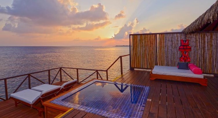 Потрясающий остров - отель!!!! Чудесный океан, шикарное бунгало на воде со стеклянным полом, с джакузи, с мини-бассейном, с индивидуальным спуском прямо из бунгало в океан, отличный сервис, питание по меню, райский сад с бассейном, в котором практический никогда никого нет. Восторг, одним словом...........