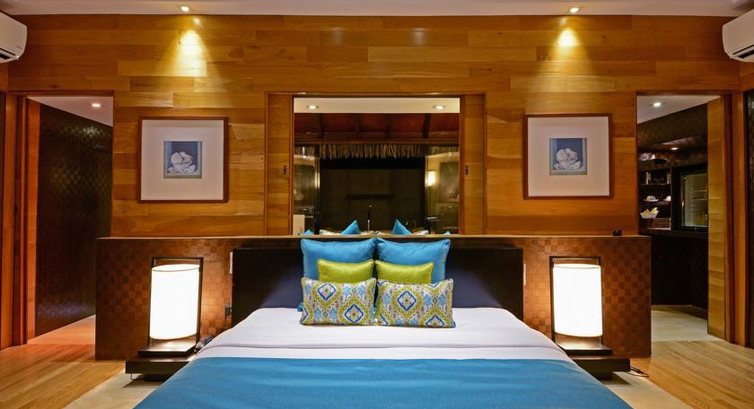 Адааран Пресиж Ваду находится в непосредственной близости аэропорта, но шума самолетов, как такового, не слышно. По крайней мере, нам он не мешал. Встречают в Ваду роскошно – нас проводили в бар, где подали полотенца и коктейли. Там мы немного отдохнули с дороги. Затем нас посадили в машину, и она повезла нас в номер. Заселение оформляют прямо на месте, не нужно идти на рецепцию. Так же нам провели подробную экскурсию по номеру. Со входа попадаешь прямо на террасу у моря. Здесь широкий лежак, небольшой бассейн и стол с креслами. В море ведет своя лестница. Эта стена у бунгало вся стеклянная. Можно убрать бамбуковые занавески, и с кровати любоваться красотой океана. Номер просторный, в центре двуспальная кровать. С каждой стороны по большому платяному шкафу, мягкому дивану, столику и своя дверь в ванную. Телевизор на стене перед кроватью. В ванной стеклянный пол, где можно наблюдать за рыбками, удобный диван, стол, минибар и кофемашина. Мы за сутки выпили наверное недельный запас кофе, до чего вкусным он получался! У каждого своя раковина, очень удобно. Душевая кабина отдельно в стороне, еще один шкаф. Над диваном открывается окошко в комнату. В ванной еще один телевизор. И выход к джакузи под открытым небом. Ночью включается красивая подсветка. Необычайно романтично!
