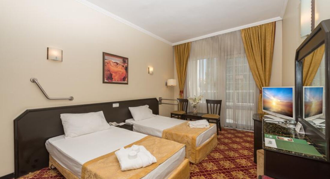 По соотношению цена/качество, пожалуй один из лучших отелей в своей категории, расположенных в центре Антальи. Стандартные номера, как в большинстве обычных 4-5 звездных отелях Турции, с отличным видом на море или боковые номера с частичным видом на море и город. Номера чистые, убираются регулярно, техника не новая, но всё хорошо работает. Для отдыха с маленькими детьми и тем, кто не умеет плавать, будет не очень комфортно на море. Пляжа у отеля нет, поскольку отель находится на высоком берегу. Внизу у моря есть платформа и при входе в воду сразу глубоко - более 2-х метров. Меню не очень изысканное, обычные для Турции напитки (нормальное пиво, плохое вино, отличная раки) и простая еда хорошего качества. Простая анимация, не такая масштабная, как в больших пятизвёздных отелях, но для тех кто не может развлечь себя сам, вполне хватает. Территория небольшая, как и во всех городских отелях. Персонал дружелюбный, все стараются, работают (за редким исключением, как и везде). Рядом с отелем много кафе, парк. По параллельной улице ходят автобусы и маршрутки, на которых можно добраться куда угодно, хоть в Кемер. Одно из главных преимуществ отеля, близкое расположение к центру. Кому не хочется сидеть в отеле может развлекаться сам. Можно гулять в соседнем парке или поехать в старый город. А можно в центр занятся шопингом, поехать на дискотеку в Бич-парк, в аквапарк, аквалэнд, лунапарк и т.д. Отель подойдет для отдыхающих всех возрастов. В целом нам всё понравилось, поэтому решили приехать в этот отель ещё раз. Люди, которые пишут негативные отзывы об этом отеле, совершенно не объективны, либо им случайно не повезло. В самой Анталье за эти деньги найти что-либо лучше, практически нереально