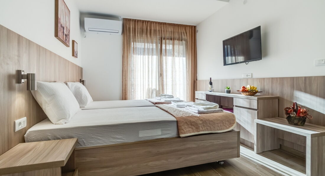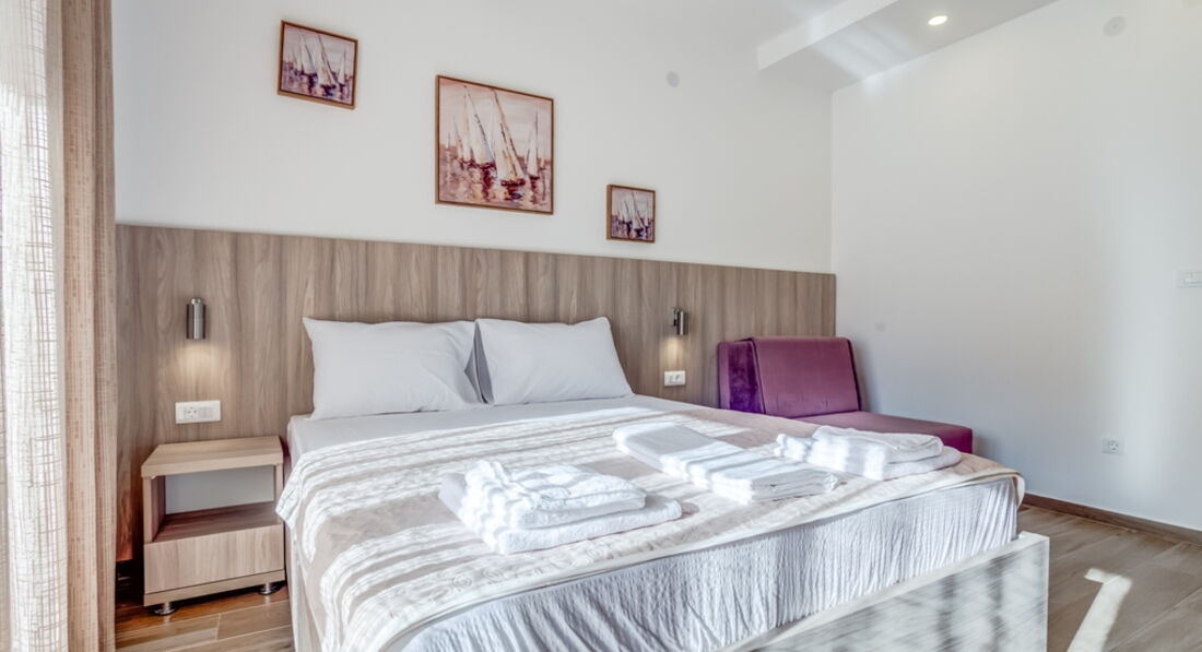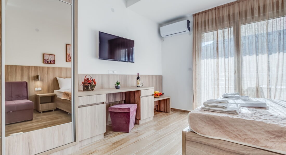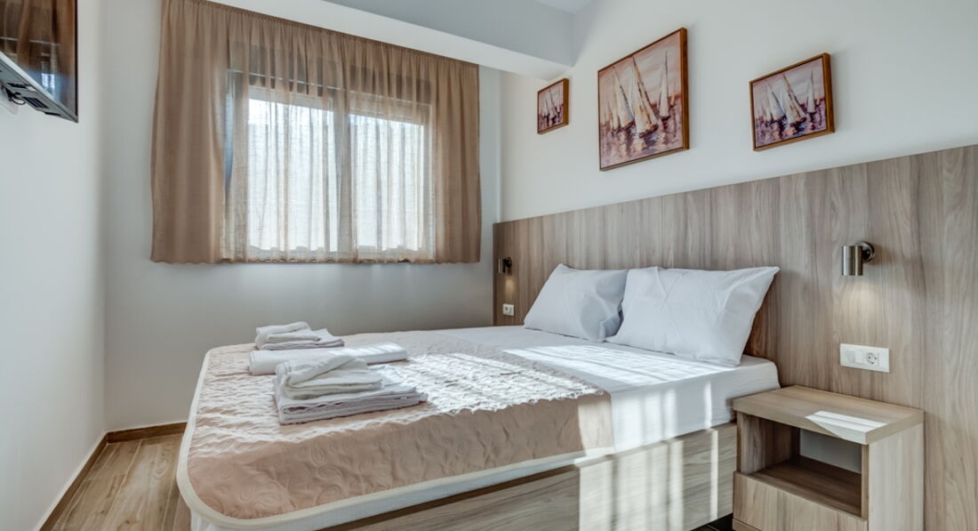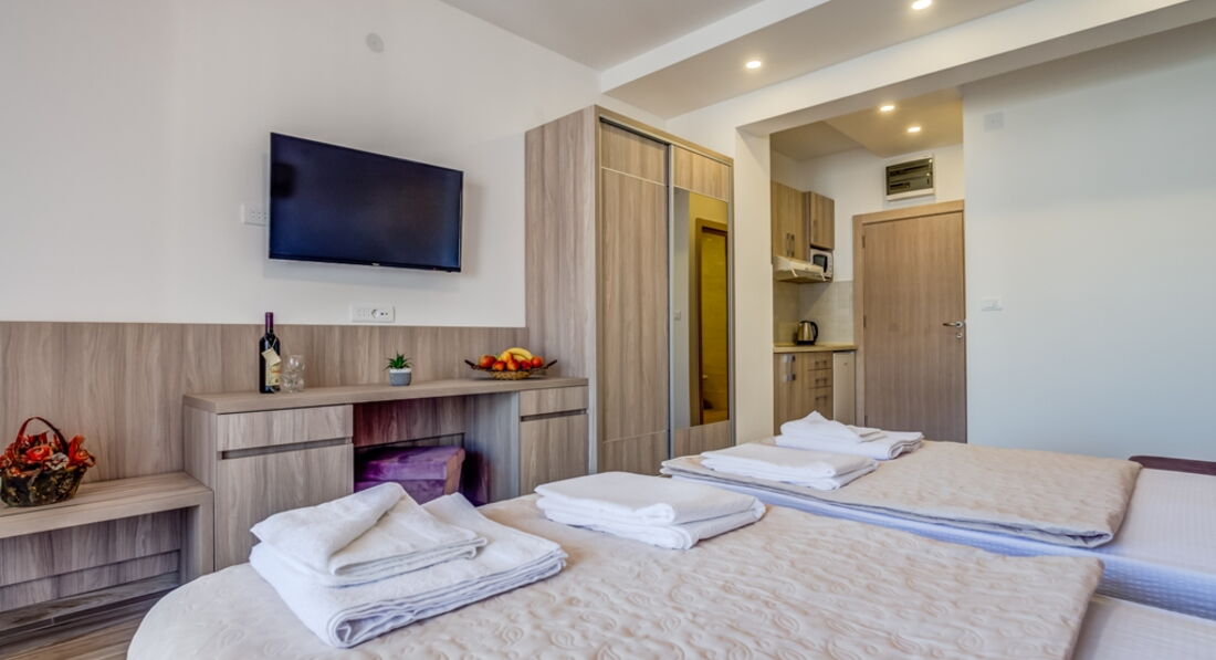 • APP 03+1 : 40м2, тераса 6м2 з видом на море, спальня з французьким ліжком, вітальня з двома роздільними ліжками, кухня