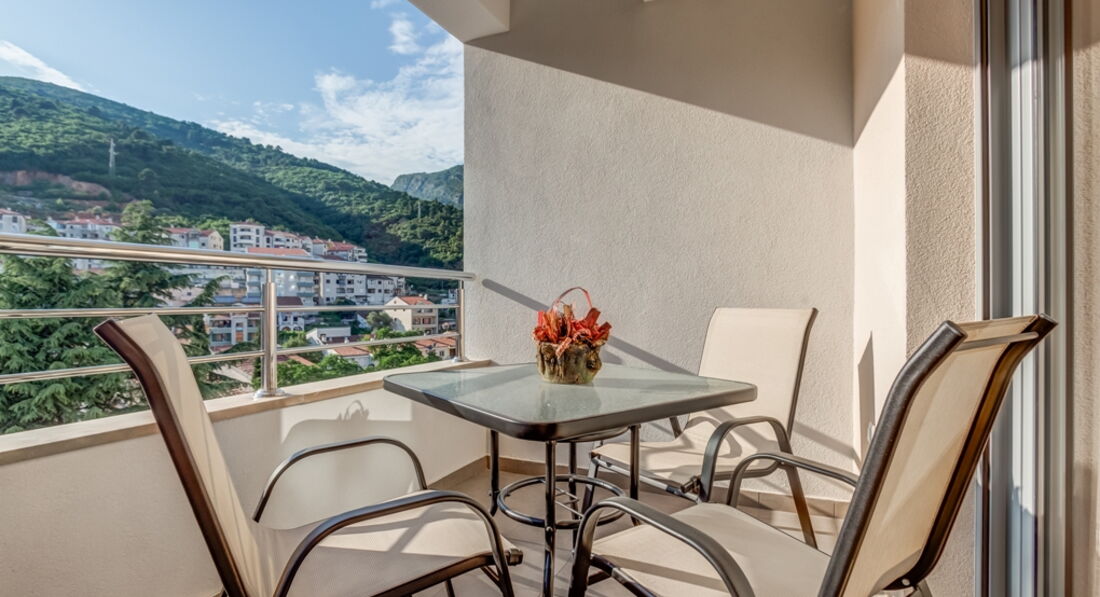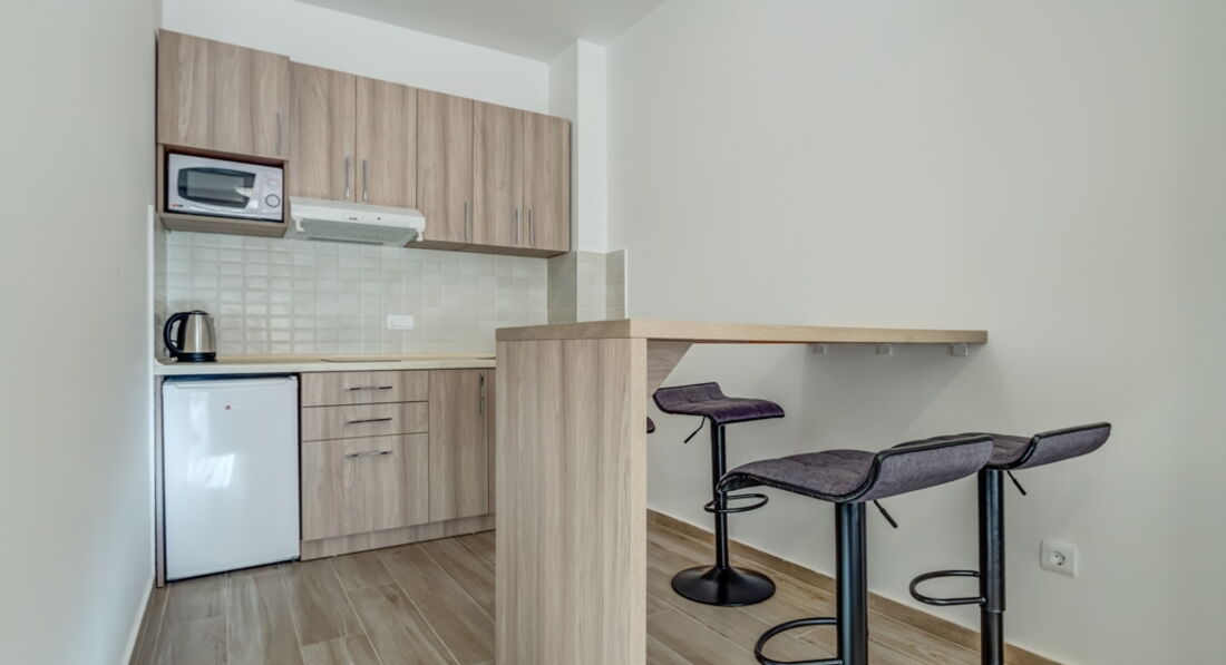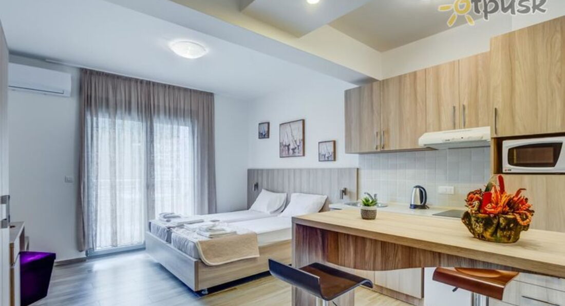 • Studio 02+1 : 26м2, тераса 6м2 з видом на море або гори, французьке ліжко + розкладне крісло, кухня