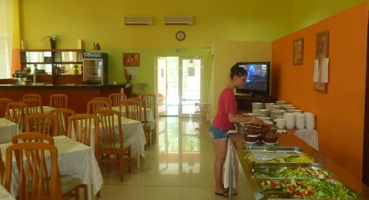 отель так себе. успокаивал разве что бассейн. в уборку номера у них входит только вынести мусор и дать туалетную бумагу. Питание это отдельная история. то что разнообразия никакого , рис и картошка все 7 дней на обед и ужин стабильно. Пюре порошковое. специи в мясо добавляют немерено. с кофем -это проблемно. просто ужасный. молоко порошковое. завтрак один и тот же все 7 дней. а персонал в столовой - это вообще нет слов! настолько хамы- просто не выразить . я в первый столкнулась с таким все включено! на бассейни кофе можно выпить только с 11 до15. вечером уже на территории отеля кофе только за деньги, а напитки порошковые типа меринда и пепси хоть упейся до 22.00. как раз все самое полезное для детей ( мы там отдыхали с детьми в количестве 60 человек). суп за все 7дней был один и тот же- куриный с вермишелью. самое что , то что мы находясь на отдыхе у моря мы рыбу ели всего один раз и то не самую лучшую. мороженое которое обещали каждый день дали всего 2 раза. фрукты тоже были ужасными. поход к морю -это то же ужас. во-первых лестница ужасная, территория где проходит лестница тоже ужасная, грязная, неубранная. пляжа там нет. там сплошные камни. в их так называемом ресторане мухи летают никто ничего не предпринимают. скатерти грязные.