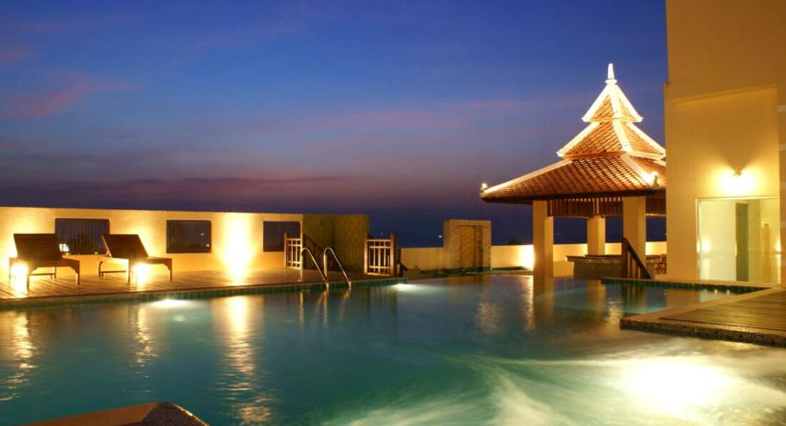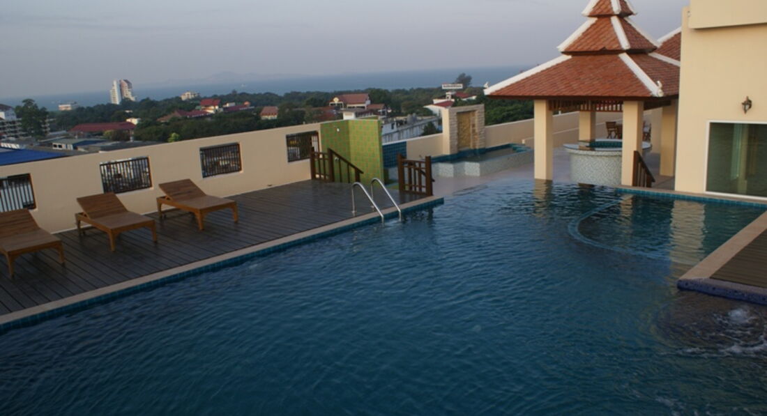 Отдыхали в этом отеле в сентябре месяце,парой с мужем,отель очень симпатичный особенно бассеин на крыше ,мы были в сезон дождей,поэтому народу было не очень много в основном китайцы да русских человек 10 , у нас был только завтрак нормальный обыкновенный яйца,колбасы,хлопья,фрукты,ананасы просто супер,чай ,кофе Жили на 7 этаже вид супер,особенно ночью вся паттая как на ладони,а вниз лучше не смотреть,я вообщем не много по другому представляла себе тайланд,но не как очень грязно и запахи просто отвратные.У отеля нет вообще своей территории,но она нам была и не нужна,так как мы там только спали ,,Вечером в баре живая музыка,замечательно поет молодая девушка и мужчина.Экскурсии брали у кокоса олега ,его агенство в 5 минутах от отеля ,все понравилось,особенно на квай экскурсовод Роман ,просто супер отдых получился,