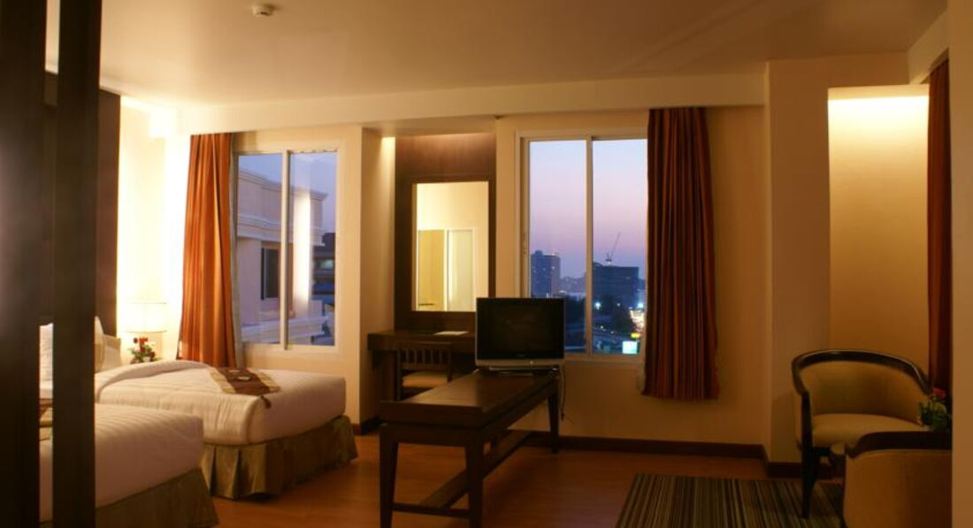 Отдыхали в отеле с 27 марта по 4 апреля 2016 вдвоем с сыном 13 лет в дни школьных каникул...Летели из Москвы туда из Внуково,обратно в Шереметьево.Оператор Корал тревел. Отель находится на оживленной улице. В отеле одни китайцы! Да,впрочем и во всей Паттайе одни китайцы. Брали завтраки- вполне приличные как обычно в отелях плюс еще острые китайский блюда...В номер заселили выше классом на 7 этаже с видом на море... вдалеке .... депозит 100 $. Номер отличный !Уборка каждый день.Порадовала сауна в отеле на крыше басплатная- в любое время приходишь,включаешь сам....Пляж в 10 минутах ходьбы. На пляже можно поесть- креветки,фрукты и т.д., а также ресторан есть. Ездили на остров Ко-Лан очень понравилось!!! но каждый день не наездишься- далековато....До тук-тука лучше идти к Дельфинчикам... обратно может и доедет до вашего отеля.... Ужинали в ресторанах в среднем 700- 1000 батт на троих (1400-2000 рублей).Обзорная бесплатная экскурсия с Коралом понравилась! А вот Ног Нуч+Храм+Змеиная ферма- утомительна... мало того что дорого, да еще и возят по магазинам ,которых нет в программе... Лучше съездить самостоятельно или купить в многочисленных агентствах на улице ( русские хозяева). В отель обязательно вернемся!