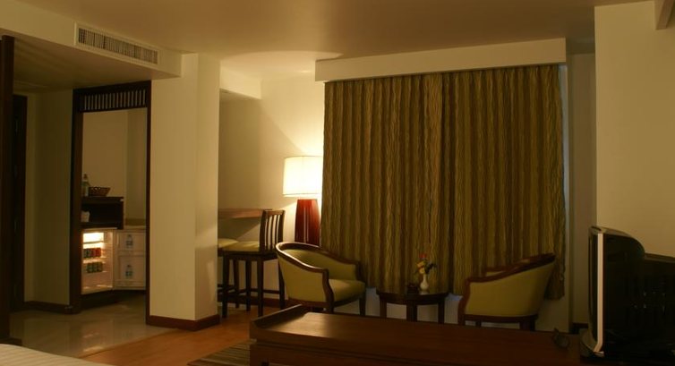 Номер. Просторный, обстановка уютная. Совместный сан. узел. Окна выходят на соседний кондоминиум. Сначала хотели поменять, но потом подумали, что в номере мы находимся только вечером и соседство здания напротив при наличии плотных портьер нам совсем не мешает, да еще к тому же вдалеке видно море. В общем вид из окна нас удовлетворил. В номере есть сейф(разобрались быстро даже без инструкции), мини бар, ЖК телевизор с двумя российским каналами (НТВ и РОССИЯ), чайник, две бесплатные бутылки воды(добавляется ежедневно в не зависимости осталась у вас вода с предыдущего дня или нет. Положено 2 бутылочки в день - получите). Уборка и смена полотенец - ежедневная. Мы через день оставляли горничной по 10 батт чаевых. Мебель видно что не новая, но выглядит вполне аккуратно и достойно.