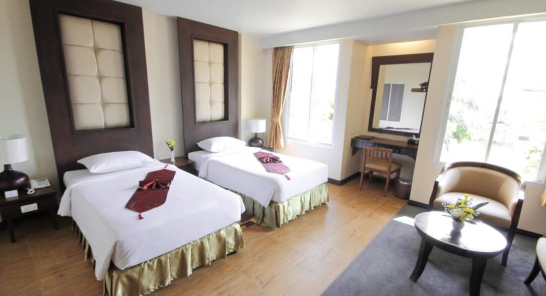 Плюсы: 1 на тук-туке до рынка (хорошие морепродукты, готовят на месте) 10 минут, до центра 10 минут. 2 ночью тихо! 3. Напротив отеля сносный массаж и обменник с нормальным курсом. Отель в целом понравился, но все омрачало хамское отношение при заселении и вранье! Купаться ездили на остров, кушали где приспичит.(проблем с животом не было). Всем удачи!