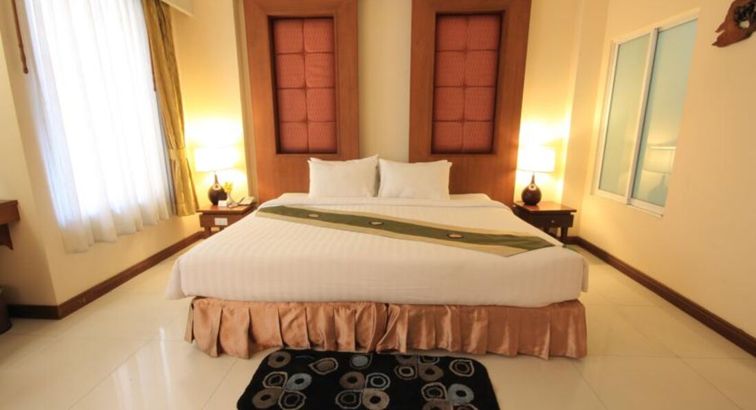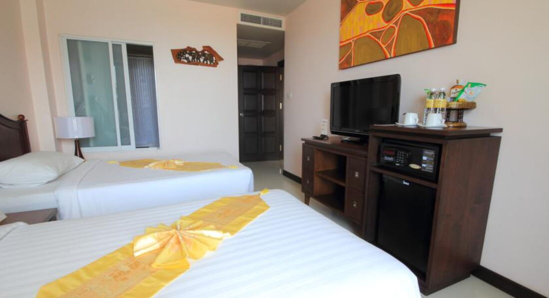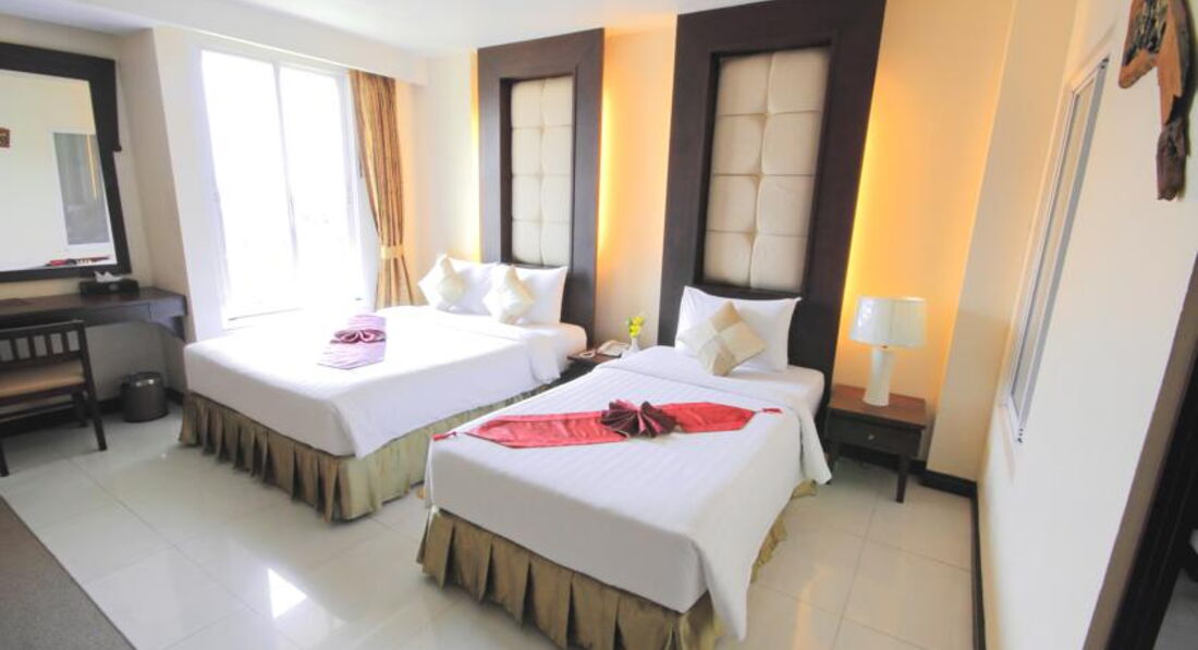 Отдыхали в этом отеле в ноябре 2013 года. Отель небольшой. Территории у отеля нету. Балконов нету. В номерах чисто, комната довольно просторная, телевизор, столик, два кресла, сейф, холодильник (платно – пиво, ром, сок, шоколад, орешки), ванная, фен. Бесплатный интернет. Убирают каждый день. Чаевые оставляли по 20 бат через день. Бассейн на крыше, лежаки, матрасы, зонтики, там же сауна, есть столики, можно заказать еду и напитки из бара. Завтраки обычные, как везде (яйца, сосиски несколько сортов, рис, лапша, тушеные овощи, сладости, тосты, булочки, хлопья, джемы, салаты, различные соусы, масло, соки, чай, кофе), голодными точно не уйдете. По вечерам в ресторане очень красиво поет тайская девушка. Персонал улыбчивый, приветливый, все здороваются, но на русском языке не разговаривают. Полотенца на пляж выдают при выходе из отеля – записался, расписался и пошел, на обратном пути сдал. На пляж и обратно увозят три раза в день, но мы ездили только один раз. Обычно ходили сами, пешком – 7 минут, не больше. По дороге на пляж магазины, торговля, салоны (массаж, маникюр, педикюр). На пляже ходят торговцы, предлагают разные вкусности, одежду, «драгоценные» камни. Рядом с отелем дорога, тук-туки идут постоянно. Бары, рестораны, кафешки. До дельфинов идти 5-7 минут. Доходите до дельфинов, сворачиваете налево там недалеко супермаркет – продукты, вино-водочные изделия, промтовары. Чуть дальше Теско-Лотус. Большой супермаркет, не дорогой. Один раз ездили на Уолкин стрит. Брали экскурсии: Полет гиббона (Супер! Здорово!), вечерний Нонг Нуч (красиво, прокатили на слонах - 5 минут, вечернее застолье – шведский стол, концертная программа с участием шоу Тиффани, Альказар), Сиамский круиз (все включено – напитки, обед, посетили три острова, купание в открытом море, катание на банане, возвращались на закате – красота!). Экскурсии брали у Пегаса. Гид все рассказал, показал, предложил, не навязчивый. Самостоятельно ездили на Тиффани-шоу (на улице у отеля покупали билеты), брали индивидуальный трансфер, очень красивое шоу, жаль, что фотографировать нельзя. Нам отель очень понравился.