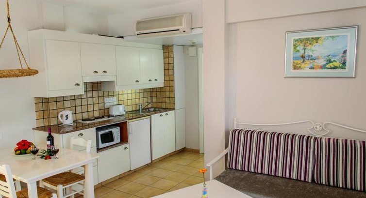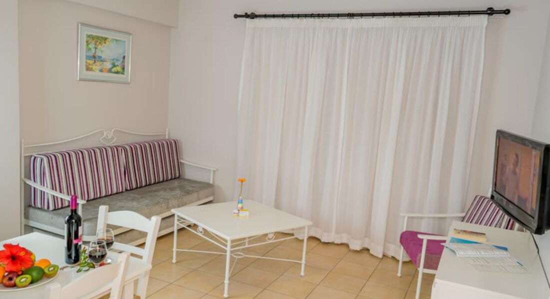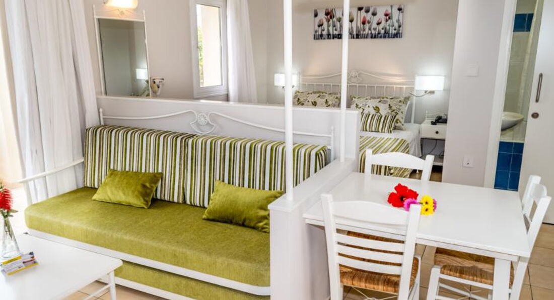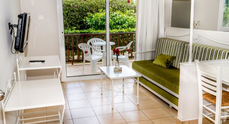В отель приехали поздно вечером, нам сразу предложили пройти на ужин, пока оформляли заселение. Сначала дали ключи от номера на втором этаже, но увидев крутую лестницу, поняла что с маленьким ребенком это не совсем удобно. Попросила поменять номер на первый этаж, девушка на стойке регистрации моментально решила наш вопрос и выдала ключи от нового номера. Под залог 2 евро выдают переходники для розеток, сейф в номере платный, нам на 11 дней он обошелся в 12 евро. Номер просторный, есть кухонный уголок со всем необходимым ( набор посуды, чайник, минипечь, тостер). По ночам были замечены комары в номере, советую брать фумигатор. В номер не предоставляется питьевая вода, это минус, но прочитав об этом заранее в отзывах, были готовы и сразу купили в местном минимаркете ( работает до 23 часов)