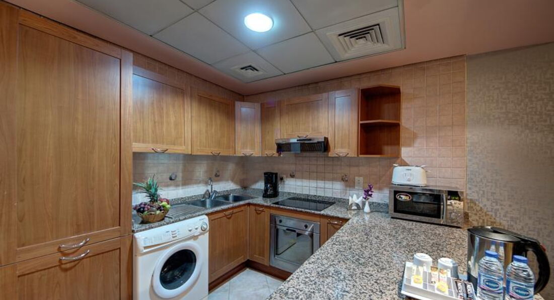 •кухня з мікрохвильовою піччю, пральною машиною та плитою