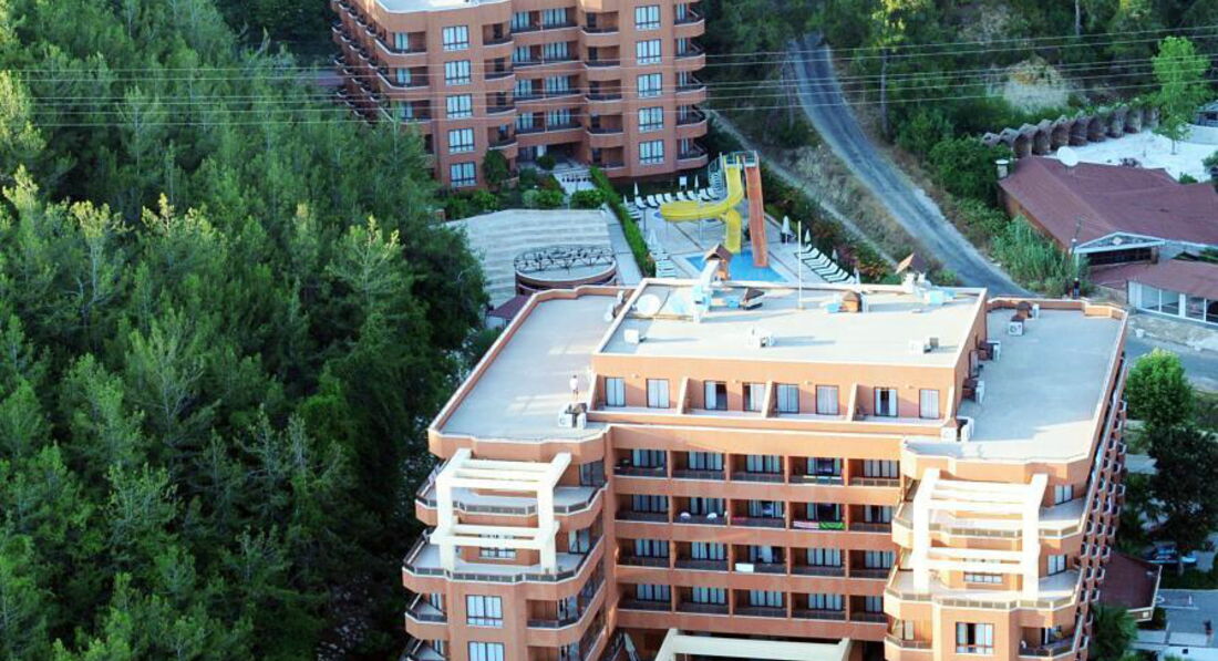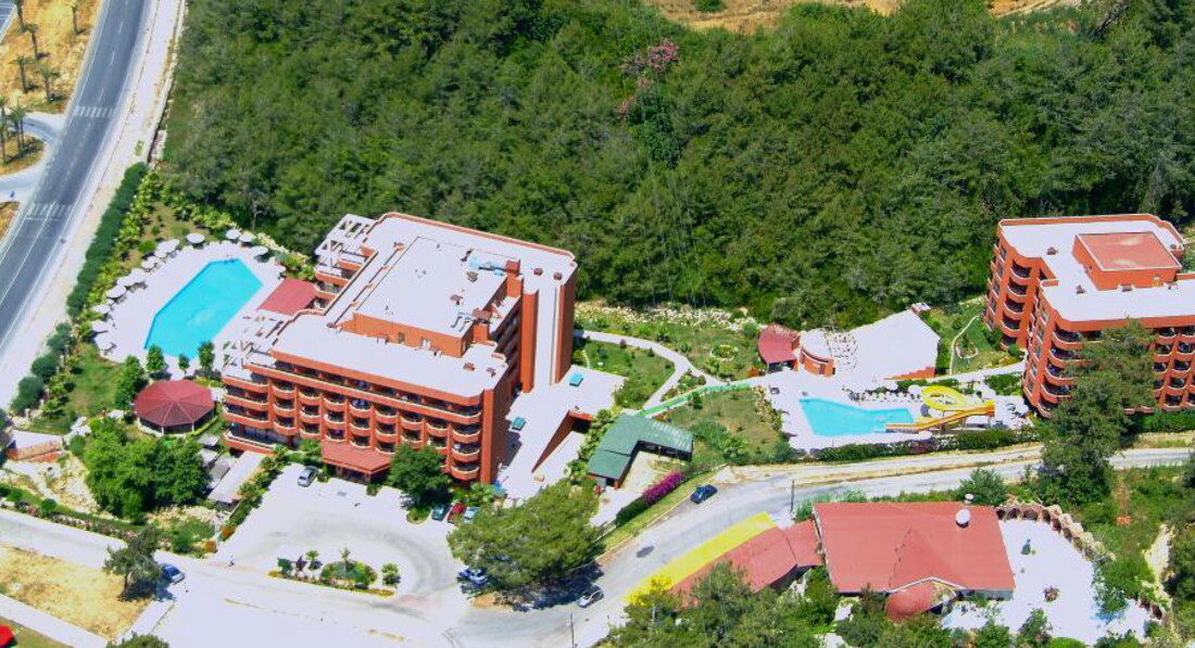 1. Расположение и территория отеля: Отель расположен в окружении соснового леса. Ближайший поселок Авсаллар находится в трех километрах от отеля. Территория не большая, два корпуса, два бассейна – причем один с детскими горками.