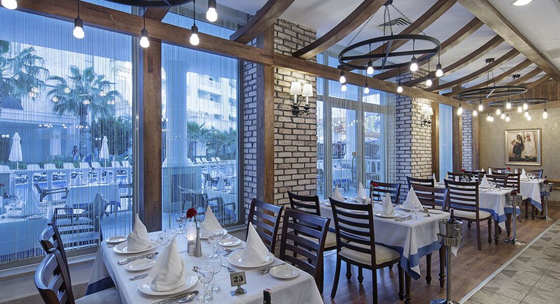 Питание (отмечу лучшее кратко): омлет готовят их выбранных тобой ингредиентов; в обед - супы; рыба разная и в разных видах приготовления на обед и ужин, в т.ч. семга и сибас, мидии, креветки, кальмары, бараньи котлетки, мясо в разных вариациях, перепелки; фрукты всегда в достаточном количестве на завтрак, обед и ужин; посуда ЧИСТАЯ и без сколов, салфетки без пятен; находиться в ресторане приятно, спиртное приносят, в т.ч. нам приносили шампанское, а также к нашему приходу иногда празднично накрывали стол (мы думали, что такое делают только по особенному случаю или за дополнительную плату); со столов убирают оперативно, ждать места не приходилось.