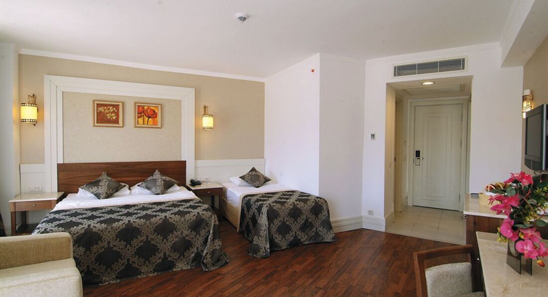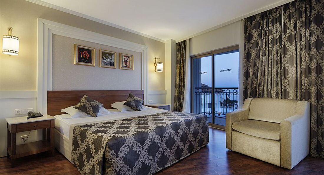 Отдахала с мужем и дочкой 3х лет, основными критериями выбора были песчаный пляж, его близость и удобный вход в море и хорошие отзывы. Все ожидания оправдались, добротный сервис, идеальный пляж, хорошие номера, отличное питание. Брали номер Superior, в номере был индивидуальный кондиционер. Вид на бассейн и боковой на море. Немного шумновато, но не всегда и 00 00 все заканчивается. Минус - у балкона широкие рассояния между колоннами, ребенок 3-4- года может спокойко вывалиться. Только из-за этого ставлю 4. Т.к. из-за этого были в напряжении. А так все новое, плазма. В ресторане только сядешь уже подходят официанты для напитков. Персонал приветлив. По русски говорят мало. В анимации были 2 русские девушки. Детской площадки нет, только детская игровая комната, вечером мини-диско. Недалеко есть рынок.