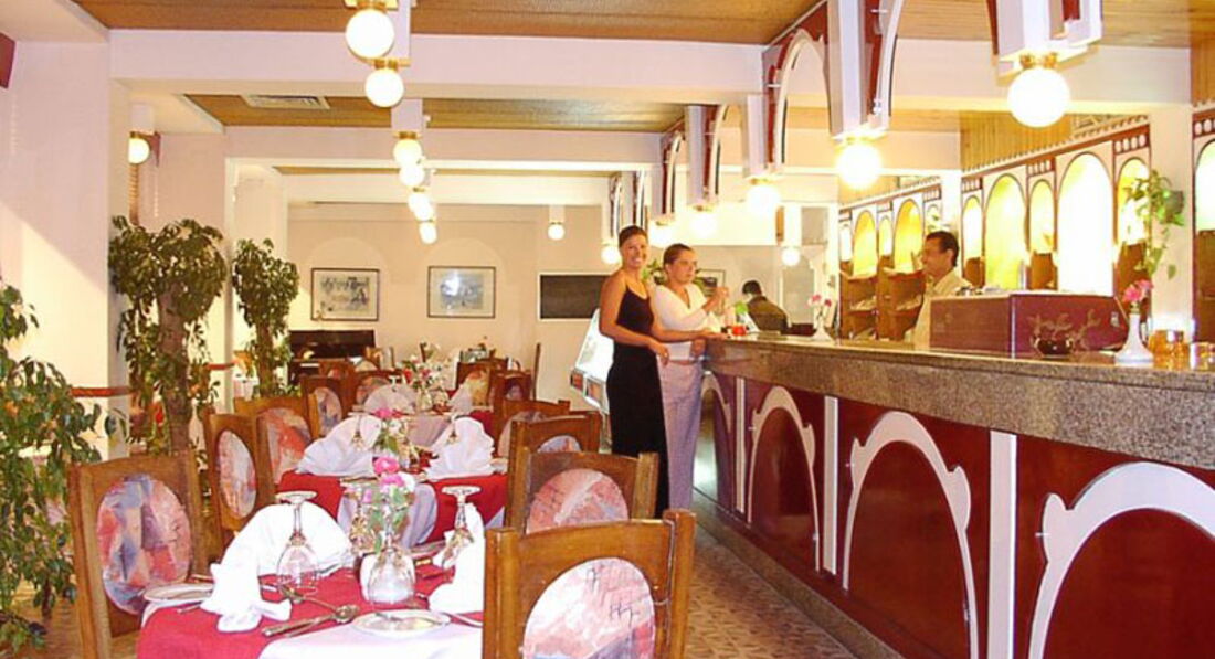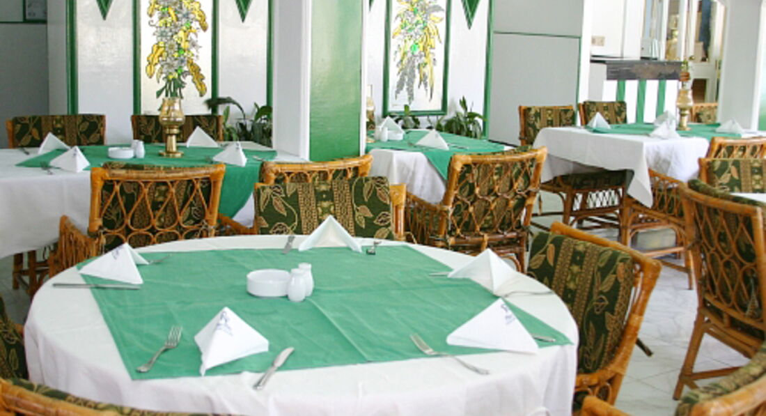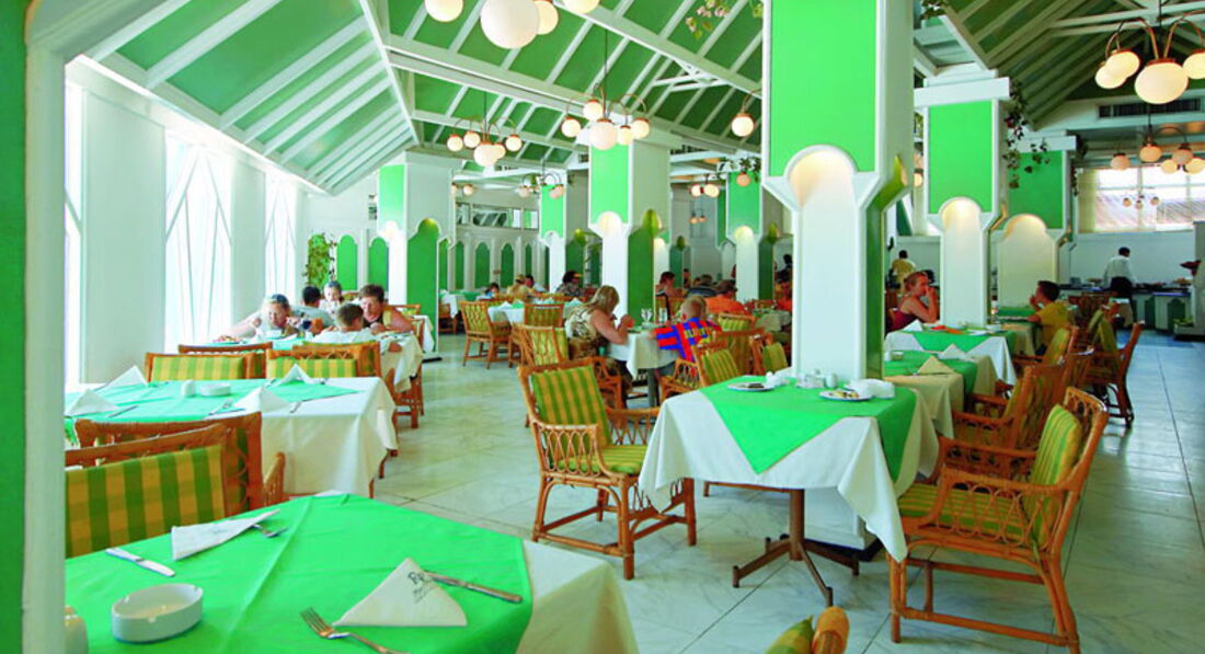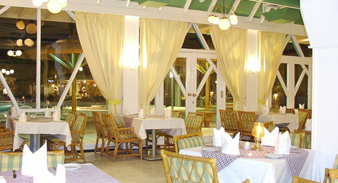 головний ресторан розрахований на 275 осіб (критий, з кондиціонером, дитячі стільці); бар біля басейну (11:00-17:00); бар на пляжі (10:00-17:00), диско-бар (21:00-24:00), шиша-бар (10:00-23:00). 2 ресторани A la Carte - італійська, рибна - платно, за попередньою резервацією.