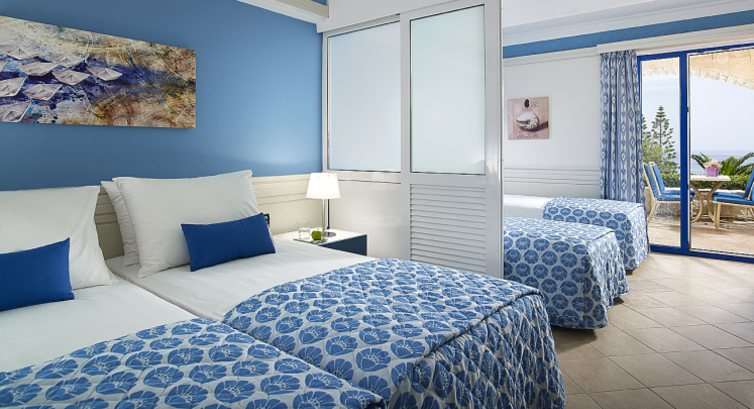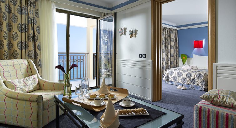 family sliding door SV (вид на море, розташовані в додаткових корпусах, двокімнатний номер, спальня та вітальня з розсувними дверима, осн. ліжко – 2 односпальні (двоспальне за запитом), доп. – 2 односпальні софи, макс. 4 чол., 29 84 м2),