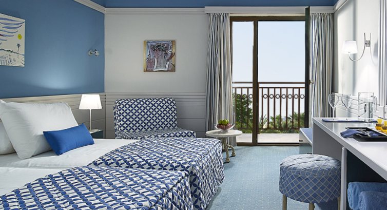 standard room GV/SV (вид на сад або на море, розташовані в головній будівлі та додаткових корпусах, осн. ліжко – 2 односпальні (двоспальне за запитом), доп. – односпальна софа, макс. 3 чол., 26,8 м2) ,
