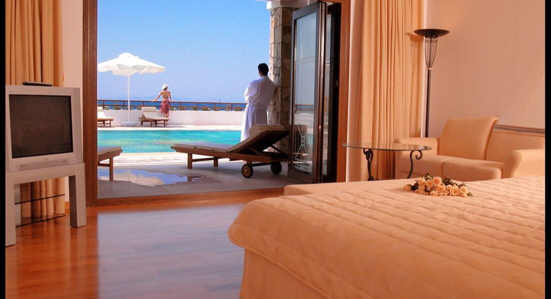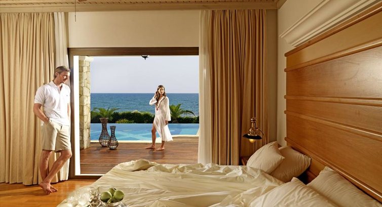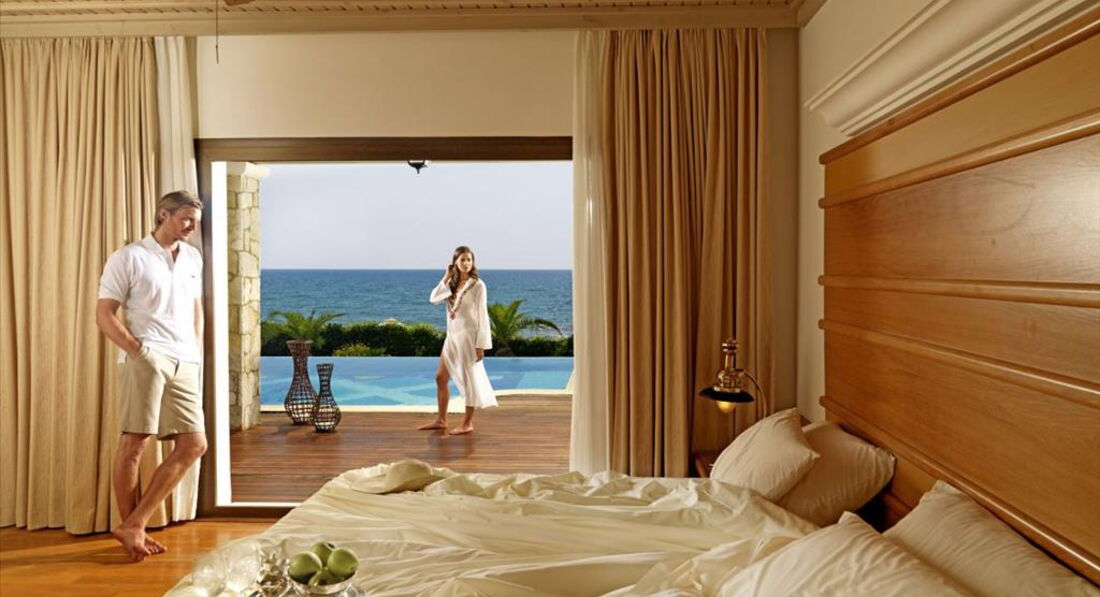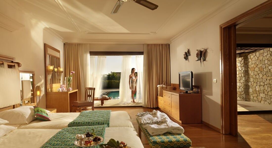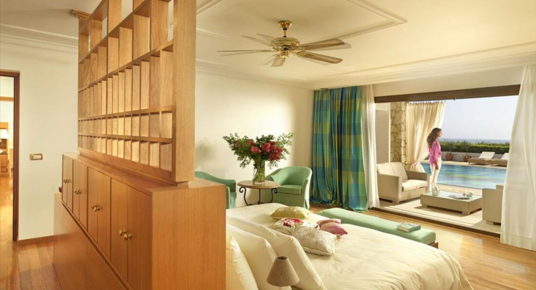 Phaidra suite (розташований на узбережжі, 2 спальні (одна спальня з кабінетною зоною), 2 односпальні ліжка в кожній спальні, додаткове – односпальне ліжко, вітальня з обідньою зоною, 1 ванна кімната з джакузі, 1 WC з душовою кабіною, тераса до індивідуального басейну, максимум 5 чол., 110 м2).