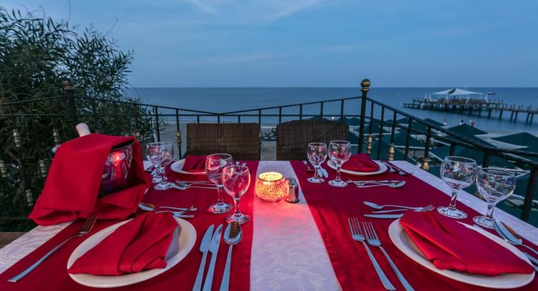 Включає: сніданок, обід, вечеря - шведський стіл; закуски протягом дня у барах готелю, безалкогольні та алкогольні напої місцевого виробництва. Свіжі соки, турецька кава - платно.