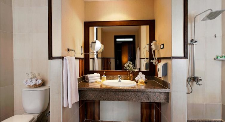 -Наш номер был полулюксом, спальней с кроватью размера «super king-size» и гостиной, креслом, холодильником . огромным гардеробом и ванной комнатой с лучшим в мире душем. Балкон был огромным, затененная зона для наслаждения красивым видом и зона для загара.