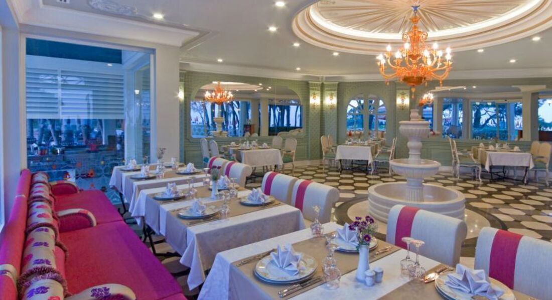 Бари та ресторани: головний ресторан розрахований на 600 осіб (критий, з кондиціонером, літня тераса, дієтичне меню, дитяче меню, дитячі стільці); бар біля басейну (09:00-02:00), бар на пляжі (09:00-18:00), диско-бар (23:00-02:00) та ін. 2 ресторани A la Carte: турецький, рибний - платно, за попередньою резервацією.