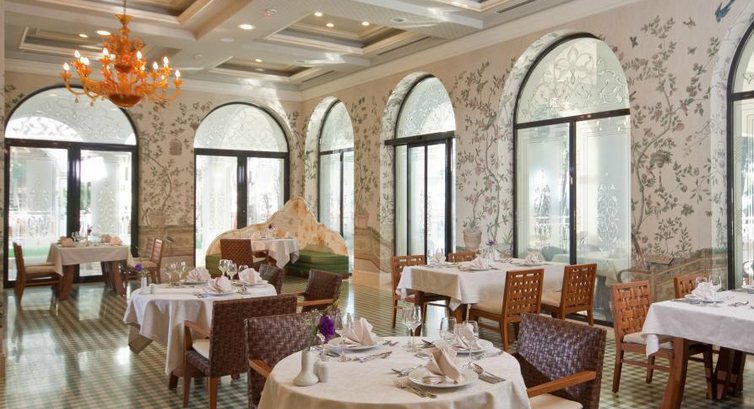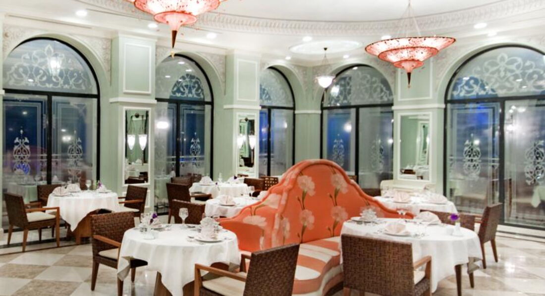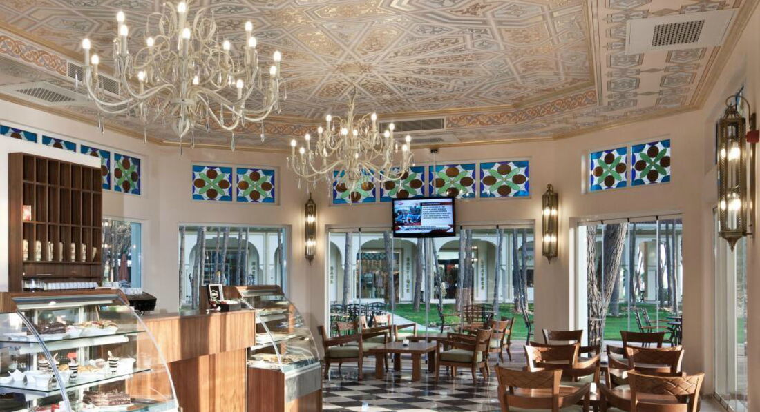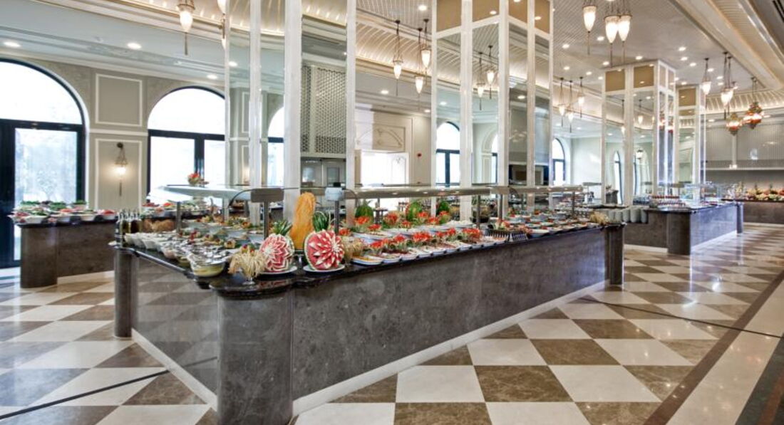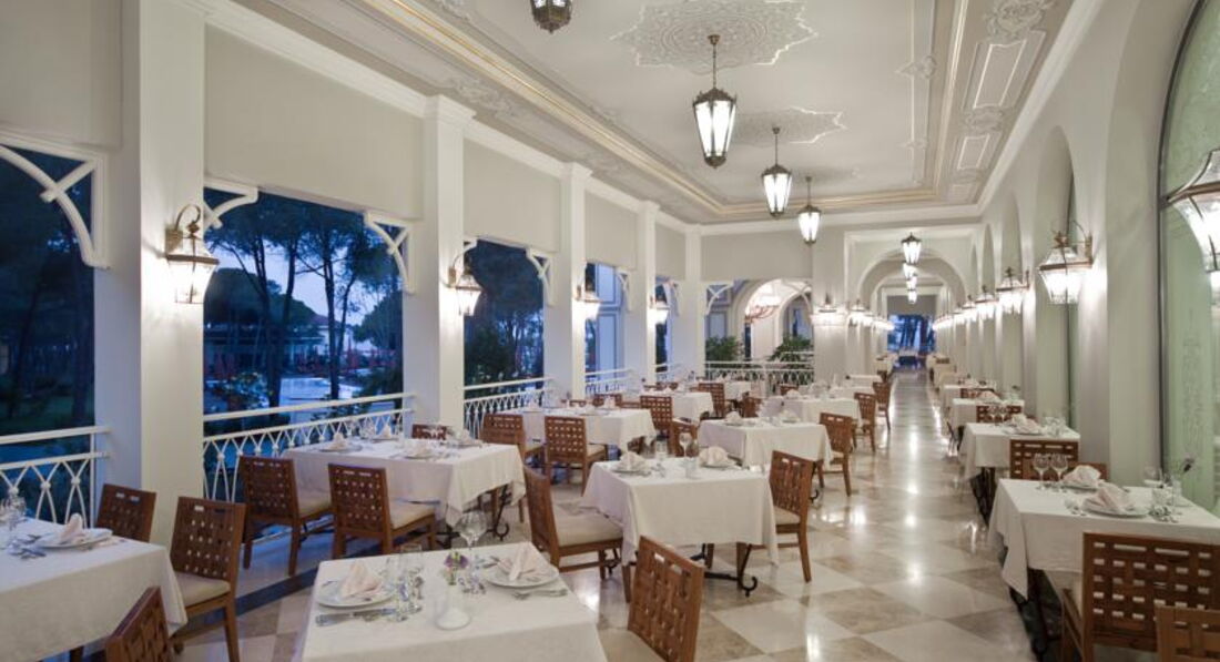 На ужине очень приятная атмосфера. Это происходит из-за того, что работает второй этаж ресторана, да и официантов хватает. А вот за завтраком и, особенно, обедом ресторан превращается в столовку, людей много, второй этаж закрыт, мест нет, официантов не хватает. Многие люди дают официантам чаевые(5-10 евро за ужин) и,естественно, их обслуживают гораздо лучше. Других гостей в зале просто не замечают. Но это происходит не везде. На терассах, например, работают одни из лучших официантов во всем ресторане, но на терассе очень жарко. Сама еда в ресторане хорошая, но не дотягивает до 5-зведочного отеля. Скорее, 4+. Десерты очень однообразные, сплошь крема и панакотты. В субботу проводили так называемый ГАЛА-УЖИН, на котором, по сообщению рецепции, должна была быть турецкая кухня. ВНИМАНИЕ ДЛЯ БУДУЩИХ ПОСЕТИТЕЛЕЙ ОТЕЛЯ! На Гала-ужине необходимо быть одетым в ЧЕРНО-БЕЛОЕ. Это ОФИЦИАЛЬНЫЙ ДРЕССКОД, чего нам не удостоилась сообщить наша турфирма АЛЬБА. Вместо этого дали обширное меню из морепродуктов, которые были плохо приготовлены. Так как морепродуктов до этого не давали, естественно, люди ринулись их набирать. И через час после начала ужина они закончились.