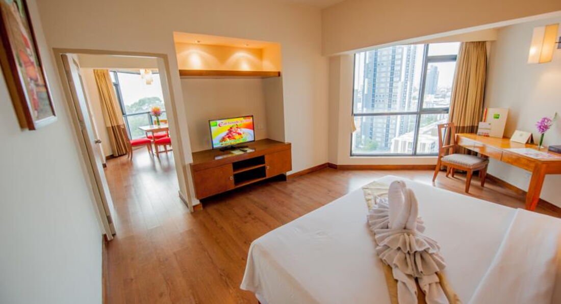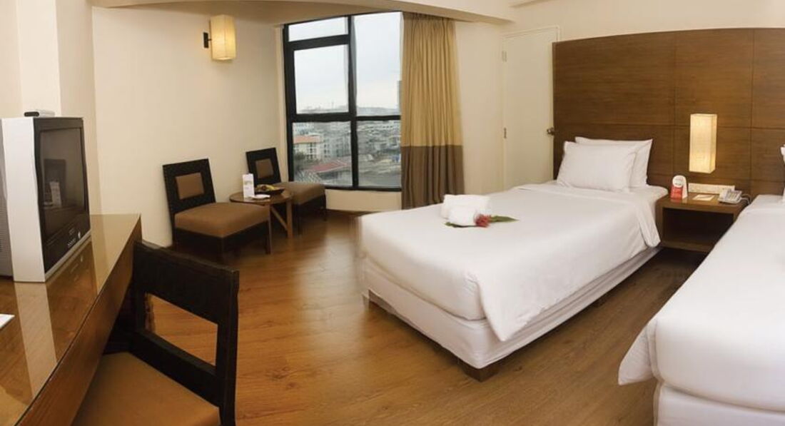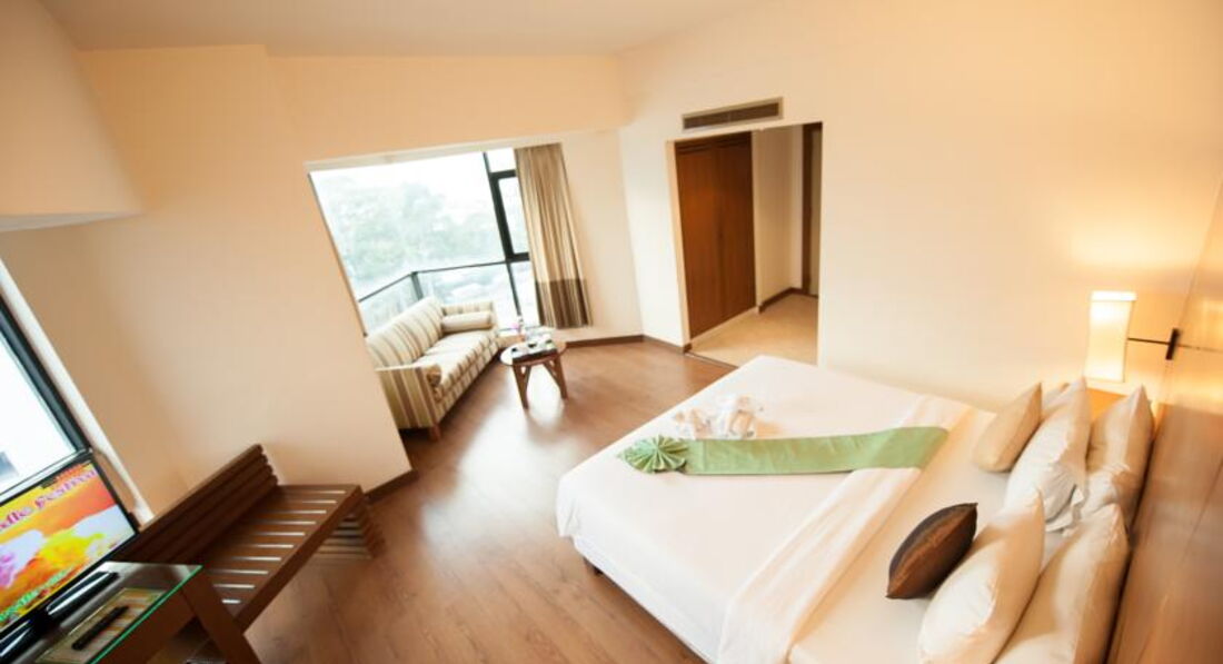Номер у нас был на 17 этаже. Вид из окна хороший. Балконов нет. Пол - ламинатная доска, лучше, чем плитка. Мебель не новая, но не изношенная. Техника работает. Есть русский канал. Сейф. Уборка ежедневная, стандартная, без мытья пола))). И чаевые на уборку, как всегда, не влияют)). Полотенце предусмотрено только по одному на каждого + одно на двоих для ног, но и его потом забрали и на замену не принесли ))). Понравилось расположение. Центр. Рядом ТЦ Фестиваль. Место тихое. В нашем номере соседей слышали очень хорошо. Просыпались от будильника соседей. Возможно по тому, что между нашими номерами была дверь(?). Запертая )). Какая слышимость в других номерах не знаем и спросить не у кого, т.к. кроме нас в этом отеле больше не было европейцев. Только индусы и китайцы. Бассейн не большой. Завтраки хорошие, не смотря на нашествие китайцев. Лучше на завтрак приходить не рано, после того, как основную массу людей развезут по экскурсиям...