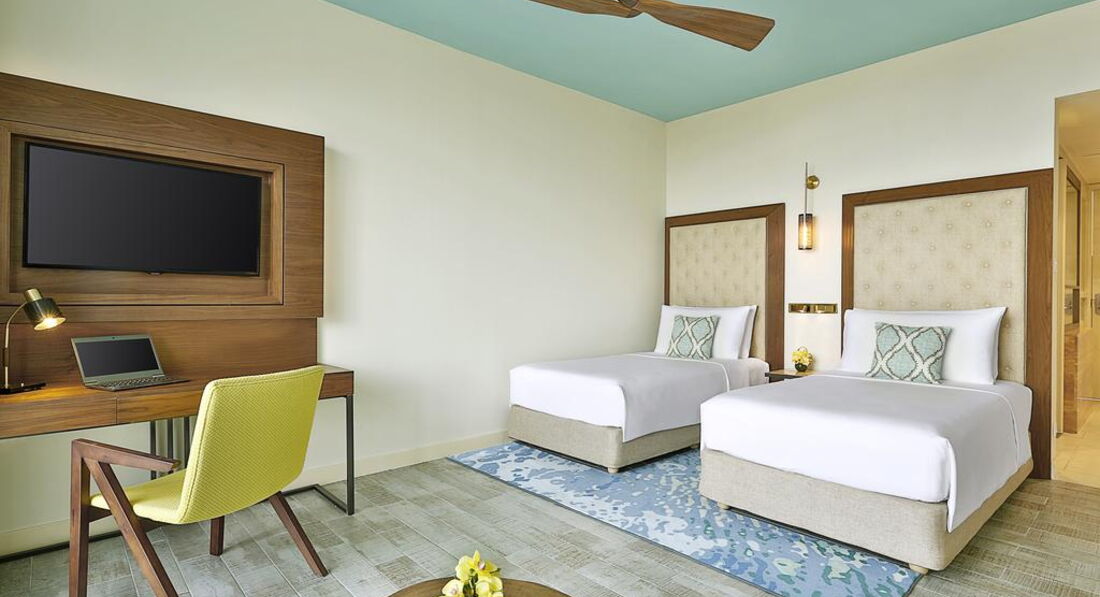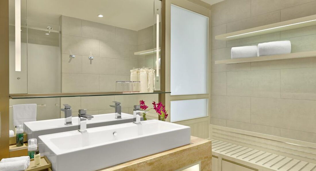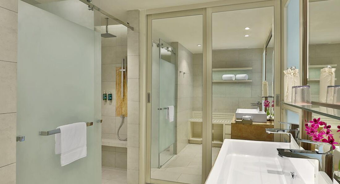 Типи номерів: • 147 Deluxe Ocean View (39 м2, одна спальня, вітальня, балкон) • 10 Deluxe Terrace Ocean View (47 м2, одна спальня, куточок вітальні, тераса) • 8 Grand Deluxe Ocean View (57 м2, спальня збільшеної площі, вітальня, балкон) • 6 One Bedroom Suite Ocean View (95 м2, спальня, окрема вітальня та їдальня зона, балкон) • Presidential Suite (360 м2, окремі спальня, вітальня, кухонна зона, балкон)У номері: • душ • банні приналежності • фен • кондиціонер • супутникове ТВ • телефон • набір для приготування чаю та кави • міні-бар (платно) • праска та прасувальна плита (за запитом) • wi-fi • сейф • прибирання номера: щоденно • зміна постільної білизни: щодня