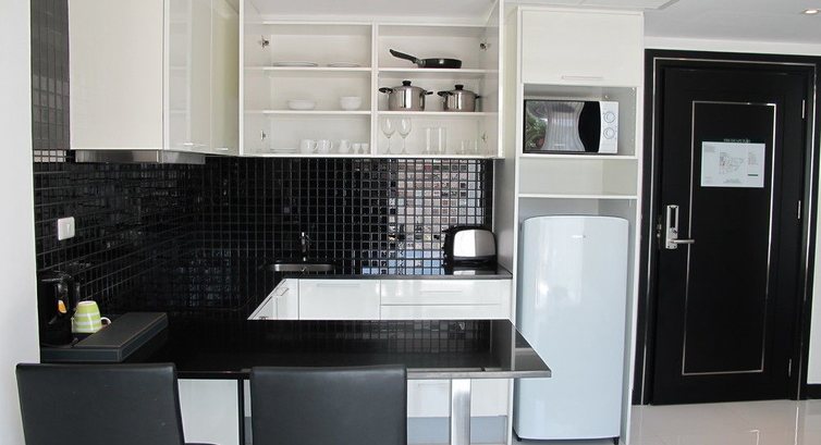 •кухня з мікрохвильовою піччю, плитою, холодильником, посудом