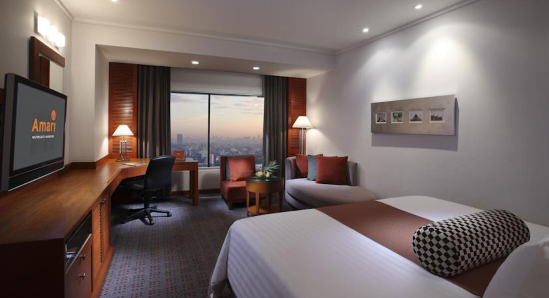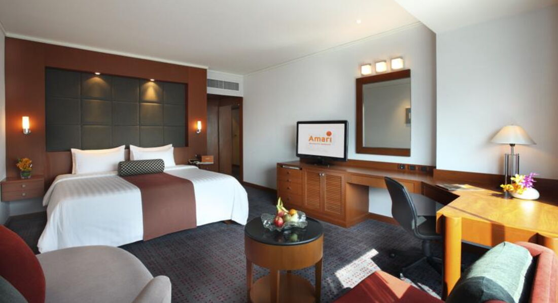 Останавливались в этом отеле на 1 сутки в феврале 2013г. В целом отель не плохой. Отношение дружелюбное. Мы жили на 32 этаже, в номере панорамные окна. Очень красивый вид на город.Особенно красив Бангкок вечером.Море огней.Очень удачное расположение-торговые центры в шаговой доступности: Central World, Big C,рядом с отелем-рынок. Номер с большой удобной кроватью,на стене-большой плазменный телевизор.В номере был Wi-Fi. В номере и ванной комнате чисто,со всем набором туалетных принадлежностей.Завтраки очень приличные,кухня на любой вкус-есть индийская,арабская,японская,китайская,тайская,европейская. Неплохой кофе.И,конечно,фрукты!!! На 8 этаже -открытый бассейн.Говорят,из бассейна очень красивый вид на город,но мы не ходили.Были ограничены во времени.В шаговой доступности самый высокий отель- Байок Скай. Есть куда прогуляться вечером. Вообщем,впечатление об отеле-хорошее.Если вернемся еще в Бангкок, с удовольствием остановимся в Амари.