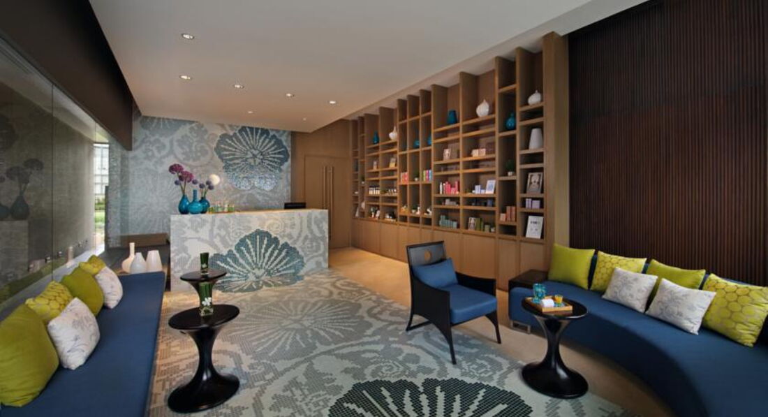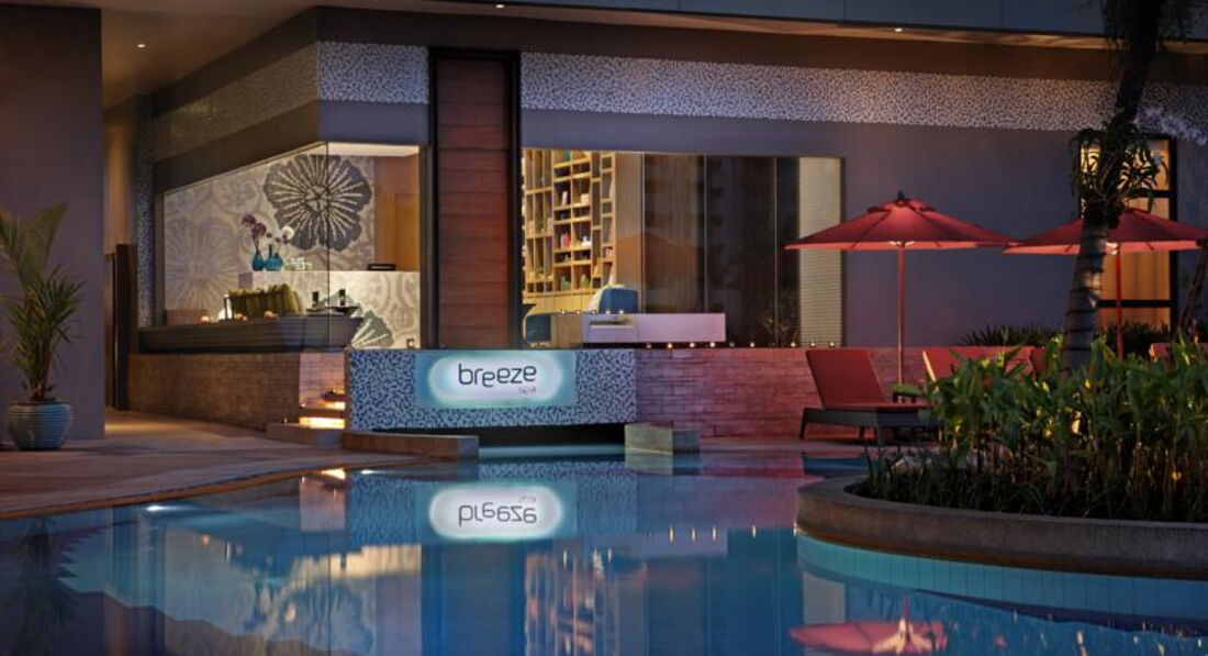 На 8-м этаже зелёный парк, бассейн на открытой площадке, фитнесс центр и, по-моему, спа-центр. В парке и вокруг бассейна стоят лежаки.