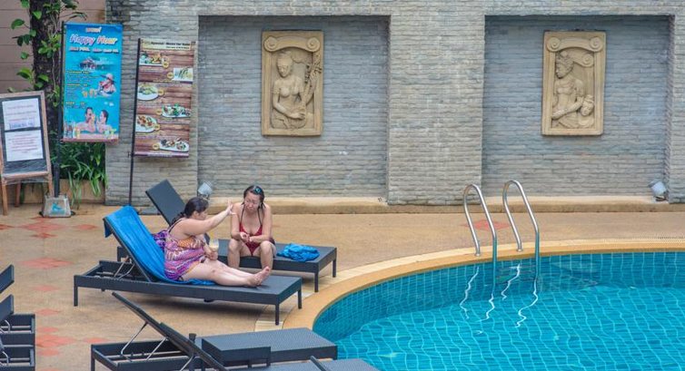 Имел честь отдохнуть в этом отеле с 19го по 29е июня 2016 года, как написали в одном из предыдущих отзывов- я отдал за путевку 23300!!!! рублей, без питания- и ни о чем не жалею!! Те, кто взял на двоих - уложились в 36000!!! Ловите акции в низкий сезон!! Вообще, пишу этот отзыв , для тех , кто в Тайланд едет в первый раз, лишенный привычного отдыха((((, хотя по приезду узнал , что : вроде-бы, как бы и практически- открыли Турцию???? Отель - Депозита нет !!! Сейф бесплатный!!! В номере, не воруют, по поводу вредителей- поскольку знал, что отправляюсь в тропики- взял за правило- поел в номере - тут же все сложил в пакет и выбросил в урну на улице. Вот ни к чему остатки еды незванным гостям оставлять))), Остатки еды нежелательно оставлять до прихода горничной - имхо . Наверное поэтому - ни тараканов, ни клопов, ни муравьев - у себя не видел. Как уже писали ниже - у отеля очень удобное месторасположение, выходишь из переулочка,в котором отель находится- и налево 30 метров , тетка на пикапе торгует фруктами, если направо- 5 минут и будет Джангл Цейлон- огромный магазин, а от него ещё две минуты и вот она, развеселая Бангла ))))), но веселая она только вечером, днем обычная улица, сначала я коротким путем на пляж ходил- прямо улочкой из отеля -по левую руку будет Розовый дом, по правую обменник, хотя ради чистоты и доступности пляжа можно и через Банглу пройти , просто там , сразу за Банглой- место с красно желтыми флагами , и от речки вонючки подальше- там кстати интересная особенность- чем ближе к пляжу, тем цены на всё выше, но- курс в обменниках лучше!! . Разочарования - миф 1- Тай страна для одиноких мужчин ??? Глядя воочию на местных жриц продажной любви- понимаешь- это рай для тех, кто очень долго был одинок, и их массаж даром не надо,благо на территории отеля есть массажный Салон Планета- там дешевле чем на улице и реально Массаж делают!! рекомендую, меня разминали массажистки Тата и Йо Йо, разминали хорошо, на совесть, и без всяких намеков на консумацию Массажный салон, из приличных- на улице легко опознать- там будут старушки , а не плешивые катои и девицы с испитыми лицами(((. Так же в отеле , в обед подают барбекю- за 60-70 бат, оно конечно- на малин Плаза- шашлык 50 бат, а на Банзане и вовсе 30- но- в отеле нормально !!!!прожаривают, не кладут сахара и перца, и это не только можно есть- это ещё и вкусно. Вообще- самое жестокое разочарования Таем- это еда- это жутко(((- из фруктов только манго и ананасы, и ещё бананы съедобны, остальное невкусно , или ядовито, взял виноград- отравился((- он у них привозной! томатный сок- это как выжатый памперс, даже в русском ресторане , у дяди Юры- можно брать только окрошку, всё остальное тайские повара готовят по своему(((. Тем, кто поедет один даю совет, что бы страхолюдные морковки не приставали - а они начинают на улице приставать, хватая руками за всякое- говорят- массаж, минет, хорошо ням ням- доставайте фото и\или мобильный- и делайте вид что будете фоткать- всё прекратиться тут же, бассейны- всегда по приходу с пляжа пользовался бассейном, что был во дворике, особенно радовала зона джакузи, на крыше тоже есть бассейн, но там был один раз- только ради фотосъемки. Номер у меня был экспресс-рассчитывал на убогую клетушку, но дали очень хороший 244, второй этаж над респой. Из недостатков отмечу-в номер надо брать свои тапочки, сменные батарейки для пульта от телевизора- и всё !! По приезду с