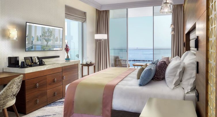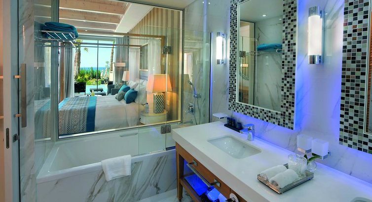 • One Bedroom Executive Suite Sea View (макс. 2 чол., 89 м2) – двокімнатний номер з окремою спальнею та вітальнею, ванна кімната, просторий балкон з 2 шезлонгами, вид на море