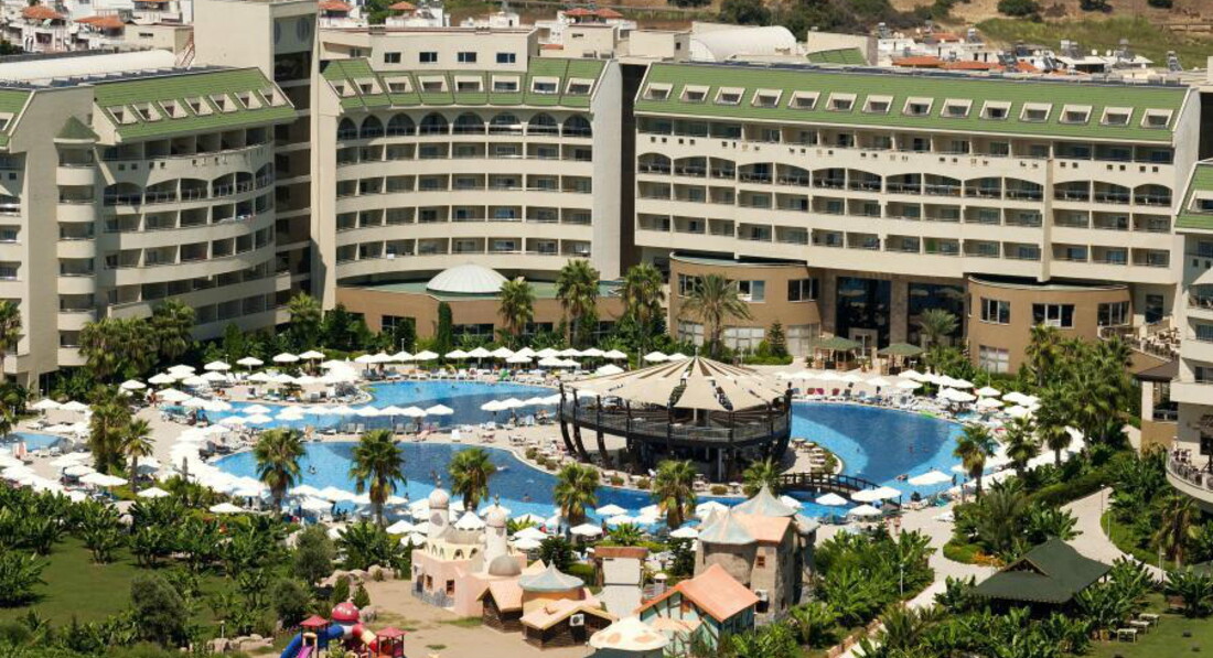 Заселили сразу по приезду. Персонал не говорил по русски, т.к. в отели отдыхаю одни немцы. На тот момент мы были единственными русскими в отеле. Номера не очень большие, но т.к. мы там только ночевали нас все устроило.Территория у отеля очень красивая, есть мини зоопарк, несколько горок, много бассейнов, детская площадка с батутом, лунопарк (но он не работал).До пляжа по подземному переходу 3 мин. хотьбы, пляж большой лежаков хватало всем, есть бар на пляже с алкогольными и прохладительными напитками, пообедать можно там же если лень идти в отель. Единственный минус находится в отдалении от населенных пунктов. Но при выходе из отеля есть автобусная остановка, местные долмуши ходят часто и можно доехать куда угодно.