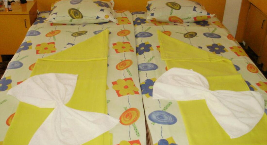 Так себе. Бельё нам ни разу не поменяли за 2 недели! Тем кто требовал меняли а если молчишь то и так сойдёт! уборка была ужасная, горничная могла бросить коврик из ванной в комнату, разложить полотенца на кровати - и всё, типа убрала, ещё и наши вещи перекладывала как хотела! Хозяева с внуком приветливые, оплаченные завтраки приносили каждому, всё вкусно, на фруктах экономили, за 2 недели было 2 раза по 2 абрикоса и раз жменя вялой черешни. Если заказывать еду на выбор, то порции меньше чем в других кафешках, а та же питьевая вода в пласт.бутылке в 2 раза дороже чем в мини-маркете за метр от отеля. Дискотек и шума вроде бы и нету, но наши окна выходили на переулочек с ОЧЕНЬ шумными болгарами, слушали их пение и лошадиный ржач до 2-3 часов ночи, а хозяева на мою просьбу с ними поговорить сказали чтобы я сама шла ругаться. Ещё не понр.что при отъезде на наши две парочки молодёжи мне начал хозяин жаловаться типа "слава Богу уехали, такие противные, это наверно румыны или молдаване!" Люди им деньги везут, такой у них бизнес и туристы все разные, мне было неприятно, т.е. я за ворота, а они так же и меня будут обсуждать?... Ну и возмущает что на многих сайтах заявлен бассейн с лежаками - НЕТУ, зачем же врать! Наверное для 2* нормально, в номере балкон, ТВ, холодильник, шкаф, но было и много недостатков, особенно мучила жара, а на 4-ом этаже самое пекло и кондиционеров нет. До моря идти по тропинке под палящим солнцем 15 минут, с малышами и колясками через мостик тяжело. Пляж хороший, чистый, дно не глубокое ровное.