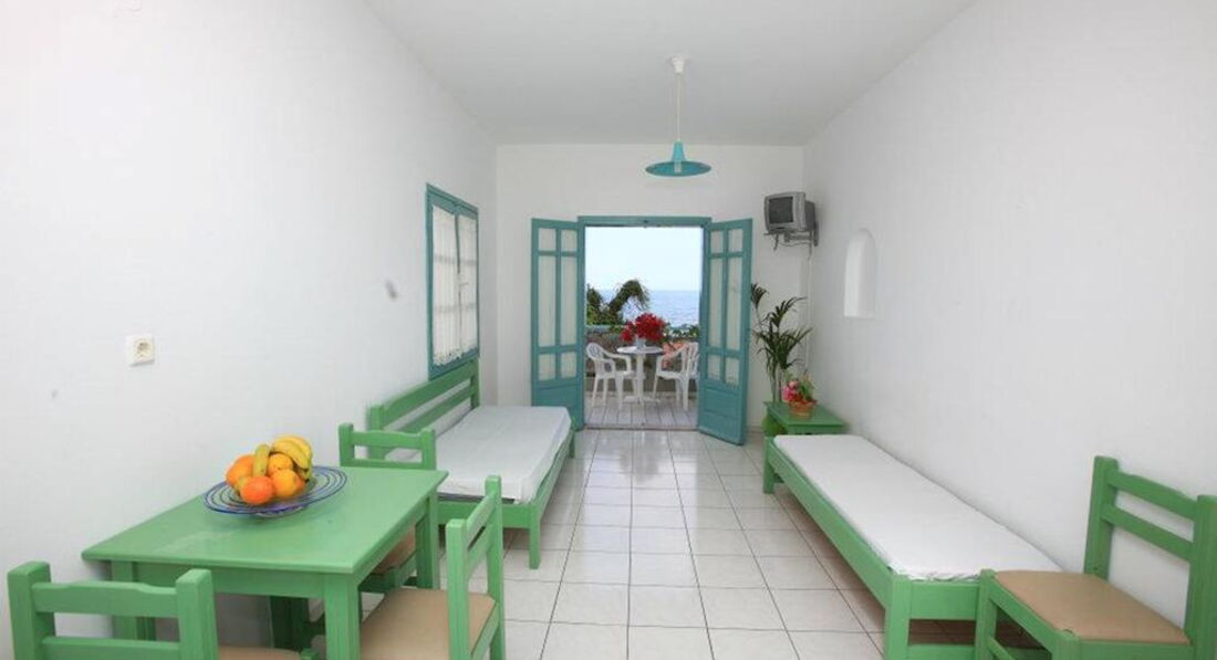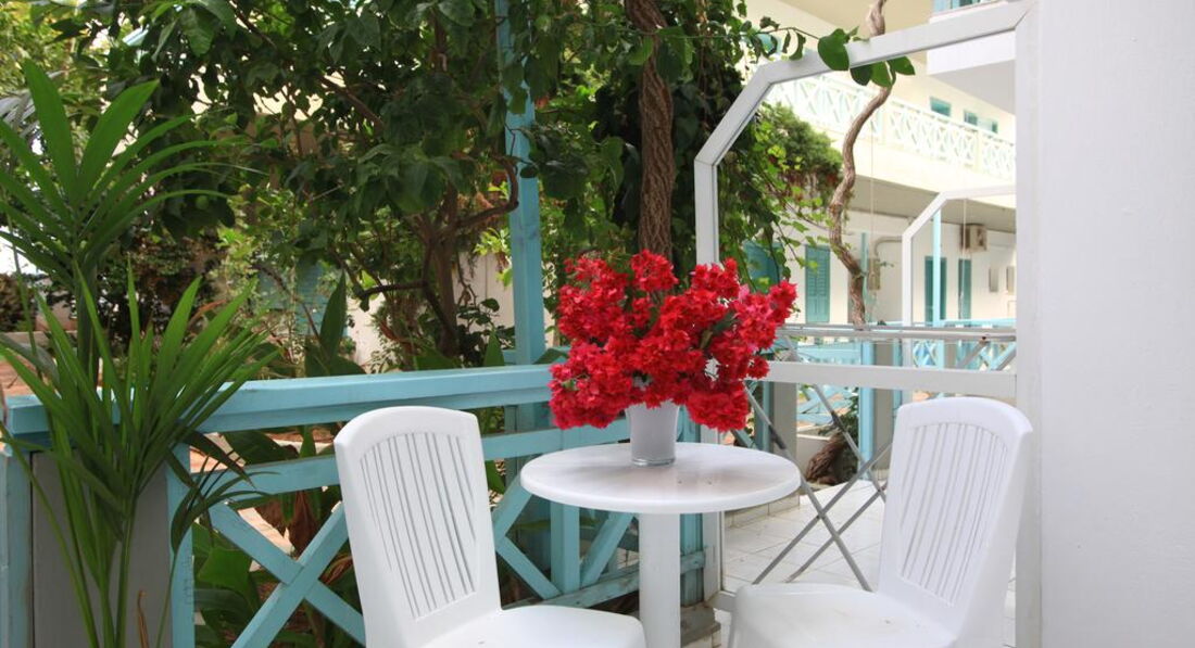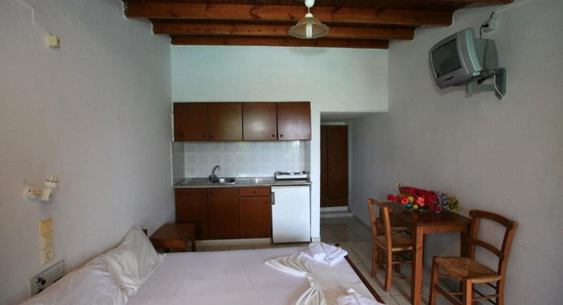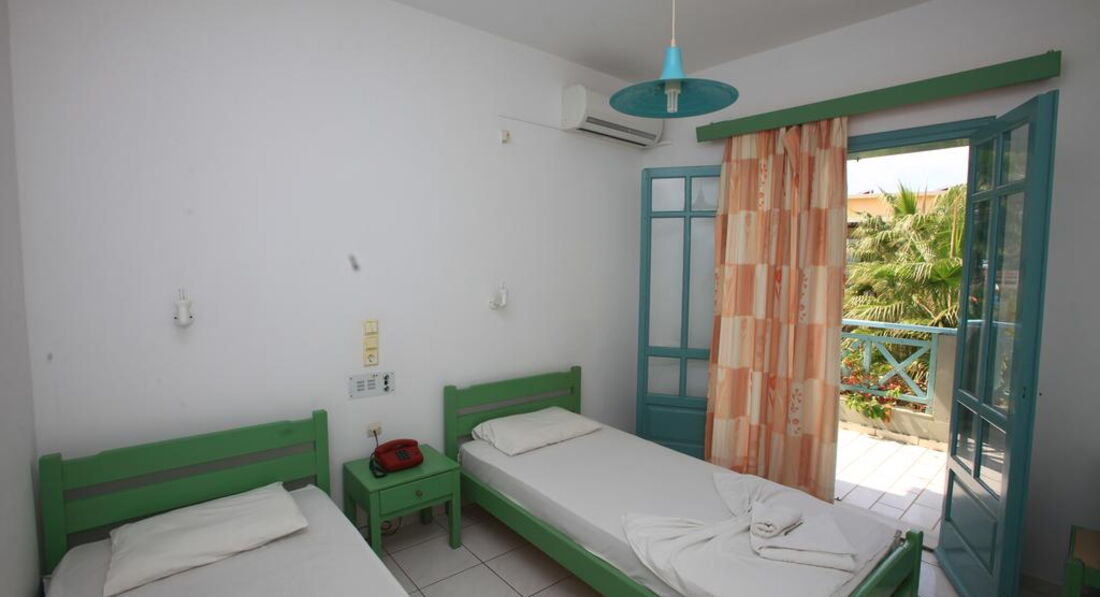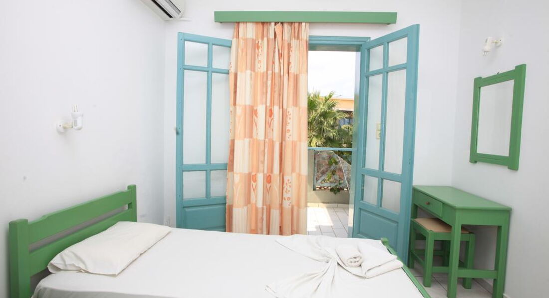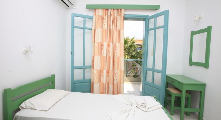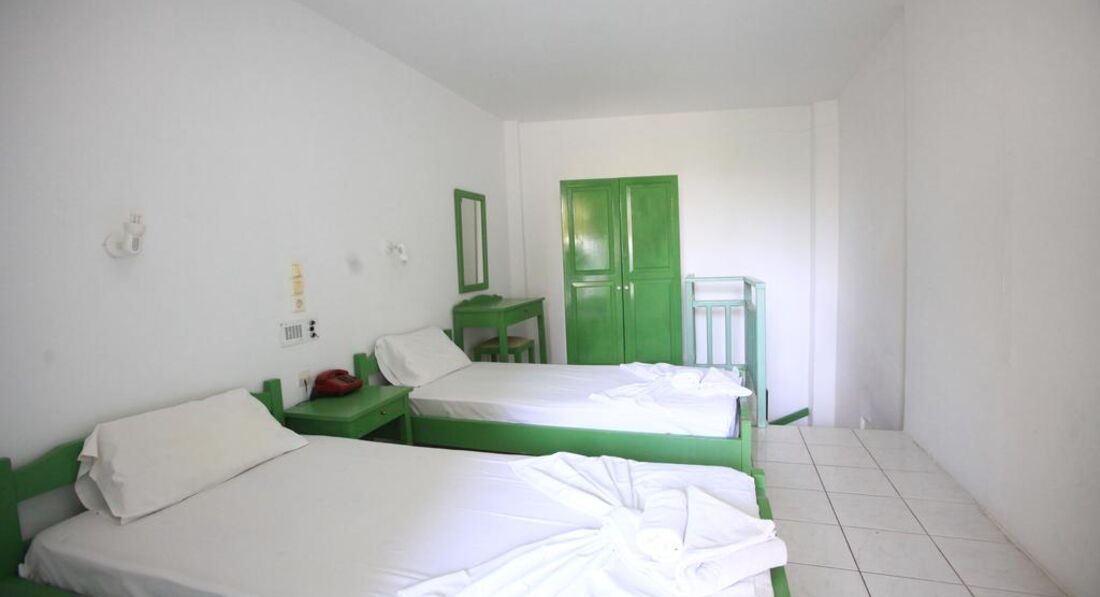 Типи номерів: 8 Studio 2 pax (основна будівля, 0-2 поверх, 15 м2, вид на море, сад або басейн, макс. розм. 2 чол., одна спальня та ванна, обладнаний кухонний куточок, балкон – у 4 номерах, тераса – в 4 номери, вікна у всіх номерах). 3 Studio 3 pax (основна будівля, 0-1 поверх, 20 м2, вид на околиці, макс. розм. 3 чол., одна спальня та ванна, обладнаний кухонний куточок, балкон – в 1 номері, тераса – в 2, вікна всіх номерах). 3 Maisonette 3 pax (основна будівля, 0 поверх, вид на околиці, 25 м2, макс. розм. 3 чол., обладнаний кухонний куточок, 2 кімнати: одна спальня та вітальня, відсутні міжкімнатні двері, балконів у номерах немає, тераса та вікна) – у всіх номерах). 2 Maisonette 4 pax (основна будівля, 0 поверх, вид на сад або басейн, 30 м2, макс. розм. 4 чол., 2 кімнати: одна спальня та вітальня, відсутні міжкімнатні двері, є обладнаний кухонний куточок, балконів немає, тераса та вікна – у всіх номерах). 8 Apartment (основна будівля, 0-2 поверх, вид на море, басейн або околиці, 35 м2, макс. розм. 4 чол., 2 кімнати: спальня, вітальня, є міжкімнатні двері, обладнаний кухонний куточок, балкон – у 6 номерах , тераса – у 2, вікна – у всіх номерах).У номері: • душ • туалетне приладдя • фен (за запитом) • кондиціонер (7 євро на день) • супутникове ТВ • електрочайник • міні-холодильник (безкоштовно) • 2 стільці • wi-fi (безкоштовно) • сейф (платно)