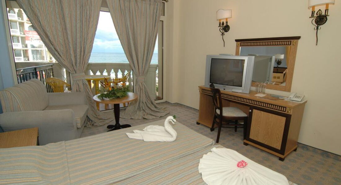 Приехали СанМаром из Москвы. В отеле были в 8 утра. Заселили одну семью только в 14.30, а вторую аж в 17.00. При этом ни деньги не помогли ни ругань (нет мест и всё тут!) и это при том, что приехавшим только что Болгарам ключи выдавали на наших глазах мгновенно.((( Хотя и всё оплачено на ALL, даже пообедать разрешили только детям (не одевали браслеты до заселения). ВСЕ общественные туалеты просто ужасны, грязь и вонь! Работал один единственный лифт, очередь собиралась огромная, топать на 6 этаж тяжело после пляжа. Уборка во всём отеле на нуле!! За весь отдых в номере выносили только мусорное ведро и то не всегда, постельное бельё положили на кровать с намёком - надо, сами поменяете (и то не всем дали). Тёк унитаз, в ванной стояла лужа. Двое детей спали вместе на раскладном диване, для взрослых матрасы раздельные. Еда однообразная изо дня в день, и то что не доели на обед, дают заветренное на ужин (хотя всегда есть рыба, мясо, курятина, картошка и макароны во всех интерпритациях). Детей в принципе есть чем накормить, но супы невкусные и пересоленные всегда. Из фруктов были никтарины, персики, апельсины, 2 раза абрикосы, яблоки и арбуз так себе. Мороженое ничего вроде. Из алкоголя пили только пиво (съедобно) и какие-то кактейли зеленые в ночном клубе (народу там мало и контингент совсем не айс). Пляж грязноват (много окурков и пластиковых стаканчиков), мало лежаков. Вход в море песок, затем пару метров камней и снова песок. Намывало водоросли после обеда с волнами. Анимацией пользовались только детской, девочки из Корела хорошо отрабатывают деньги (всегда чем то дети заняты, то рисуют, то зарядка, то на пляже что-то ваяют). В аквапарке бассейны холодные как и везде, ужасная вонь на лестницах на горки и по всюду размазанные какашки (даже на лежаках), не убираются совсем. В бар оооочень большая очередь даже за водой или соком деткам. Сама территория всех отелей очень большая и зеленая. За всеми отелями у горы дикий пляж с хорошим песком и отсутствием людей. Очень там понравилось, но пока не увидили змею...