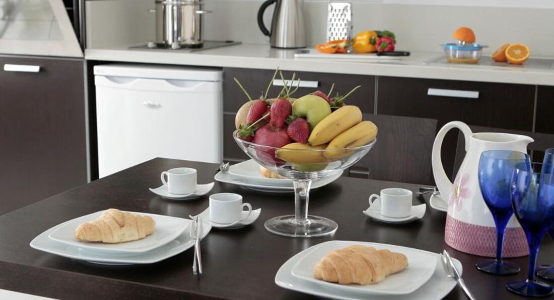 • міні-кухня (холодильник, плита, мікрохвильова піч, чайне/кавове приладдя, посуд)