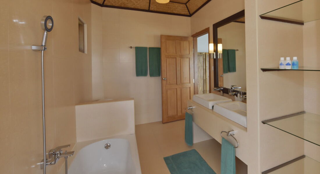 Остров маленький, обходится по пляжу за 10 минут. Плотность домиков и водных вилл высока. В некоторых случаях расстояние между ними всего около метра. У каждого пляжного дома два входа: один на веранде, выходящей на пляж, второй - вход в ванную комнату со стороны острова. При этом специальный душ для ног имеется только со стороны "задней" двери. Вроде бы ерунда, но раздражает. Для того чтобы заходить в домик прямо с веранды и не притащить гору песка на ногах мне пришлось самому поставить бутылку с водой.