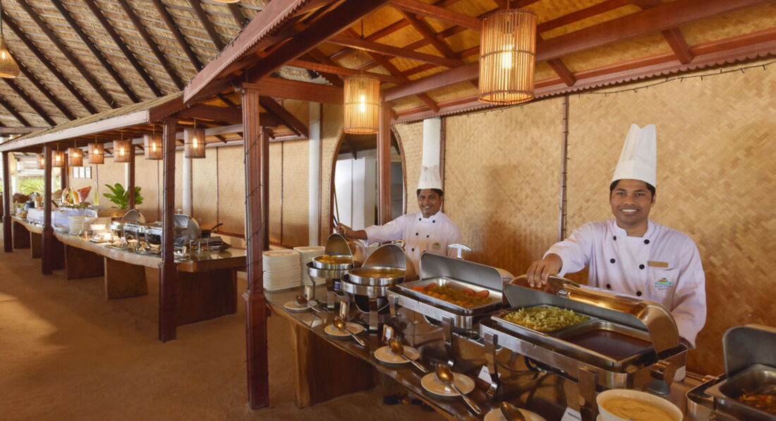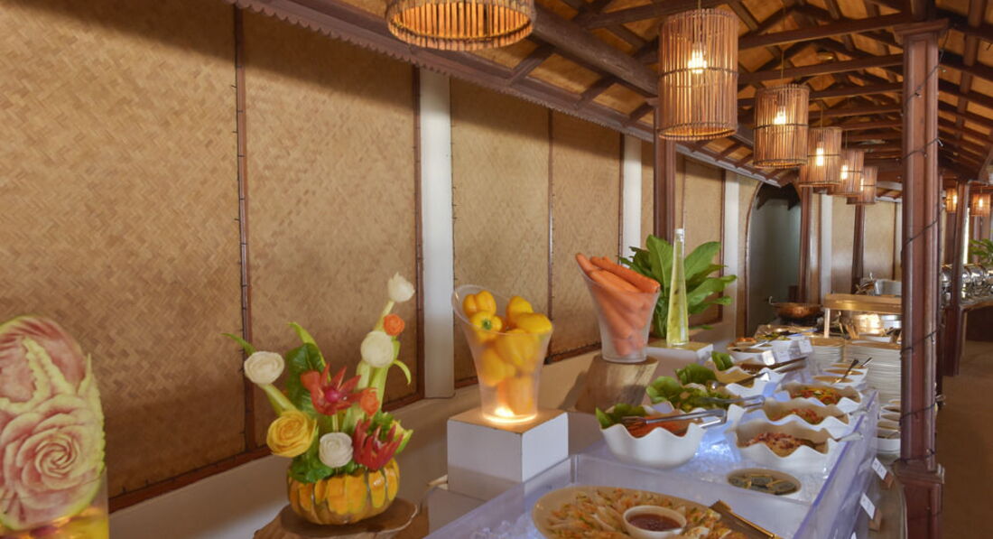 Основной раздражающий фактор в ресторане - это своеобразное отношение менеджмента отеля к процессу раздачи блюд. Вся без исключения еда лежит в открытом доступе (принцип шведского стола), тарелки и емкости регулярно пополняются и голодным никто не останется. Но вот с фруктами настоящий провал! Чтобы получить на свою тарелку арбуз, папайю или ананас, нужно попросить их порезать. Для этого существует специальный человек и процедура выглядит следующим образом: