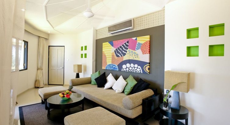 28 Beachfront Villa (88 кв.м., берегова вілла згрупована в блоки на 2 номери. Спальня (двоспальне ліжко), дерев'яна палуба, що веде до лагуни. Номери з прямим виходом до моря та садом.),