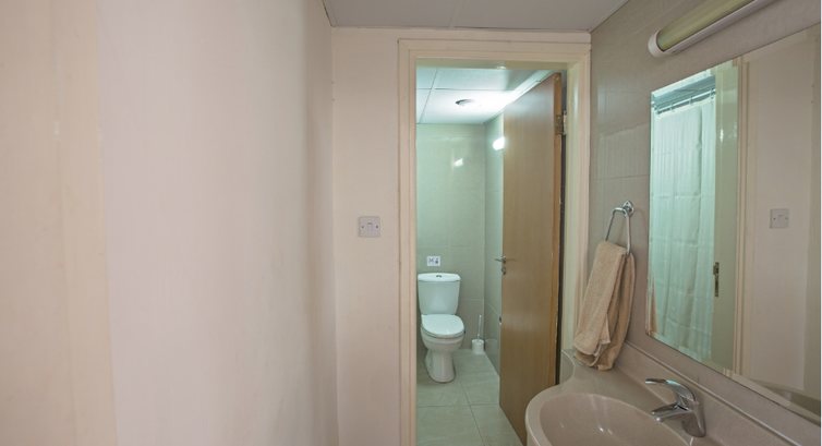 шторкой через дверь от раковины. Был маленький холодильник (который работал пока мы в номере), чайник,