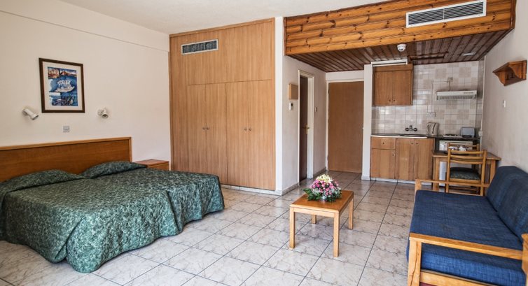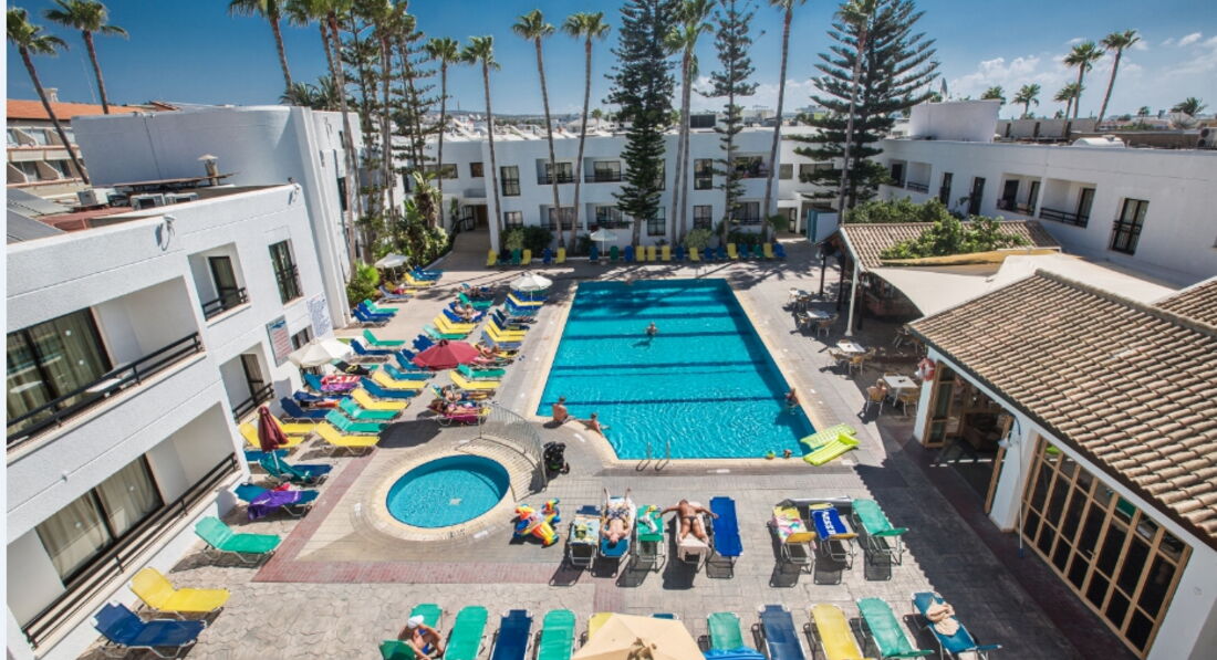 Отдыхал в этом отеле с 27.04.2014 по 04 .05.2014. Сам отель находиться в удачном месте. В самом центре города на главной улице. Сам отель хороший и номера и бассейн. Брали без питания. Хотя отель его и предлагает.Номера студио. В нем есть кухня( с плитой, холодильником, чайником, тостером. и необходимой посудой- тарелки, вилки, кастрюльки, сковородка и т.д.), обеденный стол , двуспальная кровать и диван, трюмо с зеркалом. Балкон с пластиковой мебелью. Розетки все евро. В отеле предлагают переходник за 3 евро. Но проще купить в маркете за 1.5 ). В целом номер чистенький, ремонт приличный, мебель не ушатаная) Уборка по моему раз в два дня( точно не помню)) При выходе из отеля сразу на против через дорогу самый недорогой маркет и парк аттракционов. Налево за углом отеля прокат великов- от 6 евро сутки, байков от 20 , и багги от 25 по моему. Чем на дольше берешь- тем дешевле. Проката машин тоже много. Движение левостороннее. Есть специально оборудованные вело дорожки. Права нужны. Если пойти направо от выхода из отеля- кафе с бесплатным вай-фаем. Далее доходим до перекрестка со светофором на право- дорога на пляж Лиманаки ( идти где то минут 7 от отеля мимо ресторанчиков и магазинов- совсем не напрягает.) Пляжи муниципальные чистенькие, заход супер, песочек.Вода прозрачная. Красивая набережная. Для деток вообще супер. Лежаки зонты по 2 евро- можно не брать) На пляже душ и кабинки для переодевания. Если пойти налево от светофора- там будет улица ночных клубов и кафе. Вот там и кипит все ночная жизнь. Цены в кафе от 5-7-10 евро. Порции большие)) Есть еще пляж Нисси бич- очень красивый, но до него пешочком с полчаса. Можно на велике или автобусе- тогда быстрее. Ездили в Протарас на великах ( где-то 12км.)- очень понравился и город и его пляжи и сама вело прогулка. По пути заезжали на Каво Греко- мыс с которого открывается потрясающий вид на город и море. Кипр понравился. Море супер. Отель в отличном месте и до клубов и до моря не далеко) Посоветовал бы отель для молодежи и для пар. А также для не притязательных туристов( которые не ищут все включено и качественно прокрашен ли косяк на двери)) Иногда английская молодежь до утра купается в бассейне после возврата из клубов. Но их старается ганять администратор)) Вобщем Айя-Напа город клубов, хороших пляжей и активного отдыха. Без раздумий еще раз вернусь в этот отель. Цена соответствует качеству. Всем хорошего отдыха!