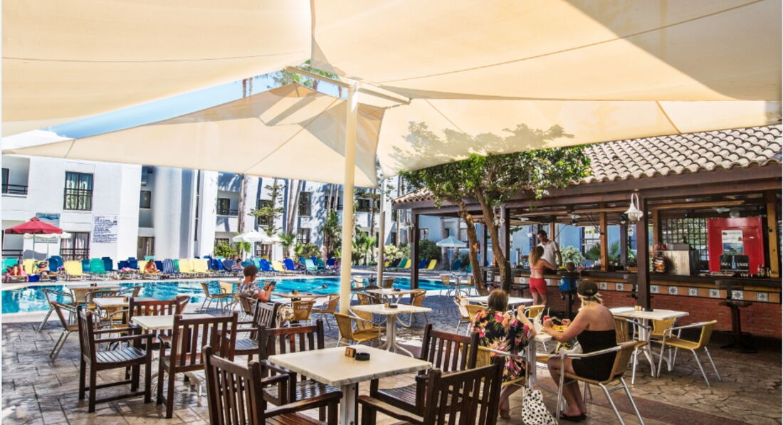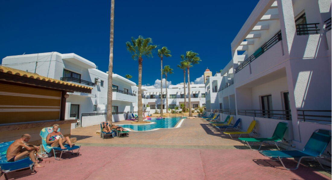 Отдыхали в конце июня 2017 года.Погода очень жаркая, но море теплое.От отеля до ближайшего пляжа минут 7-но пляж камянистый, заходить не очень удобно.До обычного городского минут 15-20, но народу там очень много.Сам отель в самом центре находится города, напротив супермаркет,рядом лунапарк, кафешки и прочие магазинчики.Номер нам дали на 3 этаже в центральном корпусе.Этот этаж только после реставрации.Все новое абсолютно, мебель, сантехника,очень большой балкон с видом на бассейн, работает кондиционер (что очень спасало) и бесплатно.На кухне есть все необходимое, кастрюли, сковородка,новая плита сенсорная, даже штопор и ножи были, стаканы, чашки, чайник,тостер.Фен берите с собой,его нет,как написано в описании.Отель чисто молодежный, контингент в основном англичане 18-22 года и все они отдыхают возле бассейна.Если хотите тихого спокойного отдыха-вам не сюда. с 10 утра до 19 тут играет диджей возле бассейна и находится в номере просто нереально, особенно если вы решили отдохнуть, при закрытой двери просто очень громко, а при открытом балконе друг друга с трудом можно услышать, при чем музыка довольна странная,и очень напрягает,диджей вообще не впечатлил ,его нужно срочно менять и делать музыку тише,т.к. даже те, кто там лежал (я не знаю мы все время на море были),но я предполагаю, что им тоже было некомфортно так громко слушать.Попросили переселить в дальний корпус, но там были ужасные условия и сырость, туда как правило селили людей постарше,ну молодежь тоже, так наши туристы тоже жаловались, что они там свою музыку слушали возле второго бассейна+ номер очень и очень плохой. Поэтому мы решили не мешать номер номер,а приходили после 19 ,на ночь закрывали двери на балкон и спали с обдувом из кондиционера.В целом все понравилось, ездили на разные пляжи каждый день, море очень чистое и теплое, еда вкусная и очень большие порции, можно покушать на 20 евро на двоих без напитков, напитки от 2 евро и выше.+ есть разные пекарни, выгодно брать комплексные обеды.можно брать 1 на двоих и наедаться.Каждый третий говорит на русском ,так что проблем с языковым барьером точно не будет)