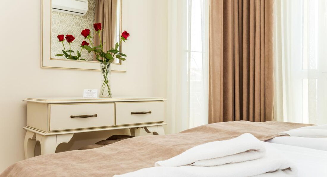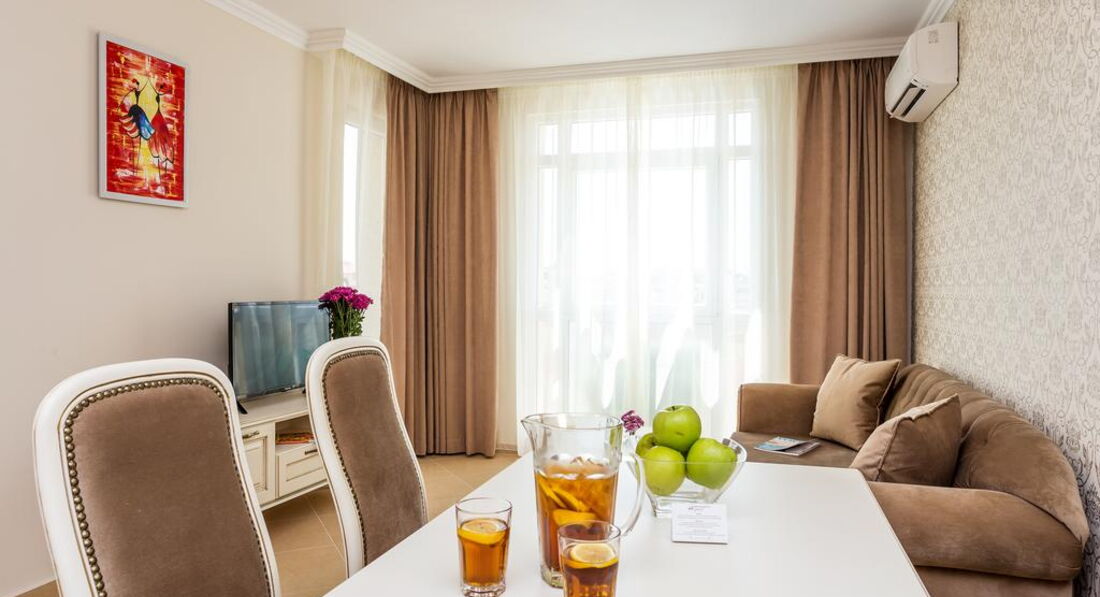 • балкон • тераса • сейф (платно) • телевізор • російські канали • Wi-Fi (безкоштовно) • телефон (платно) • фен (безкоштовно) • міні-бар (платно) • холодильник (безкоштовно) • міні-кухня • душ • Room service (платно) Територія та послуги: • пральня (платно) • автомобільне паркування (платно) • оренда автомобіля (платно) • Wi-Fi (безкоштовно) • критий басейн • відкритий басейн • водні гірки Розваги та спорт: • хамам (платно) • сауна (платно) • масаж (платно) Для дітей: • дитячі стільці у ресторані • оренда дитячих колясок (платно) • дитяче ліжко Живлення: RO Пляж: • шезлонги, парасольки (платно) • міський пляж • піщаний • пляж - Cacao Beach. До оплати приймаються кредитні картки: Master Card, Visa.