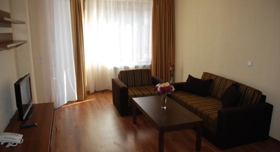 One bedroom Apartment - 50 m² - окрема спальня, 1 і 2 ванні кімнати, велика вітальня з обладнаною кухнею, витяжка, холодильник, невеликий обідній стіл, шафа, трюмо, опалення, телевізор з плоским екраном, супутникове ТБ.